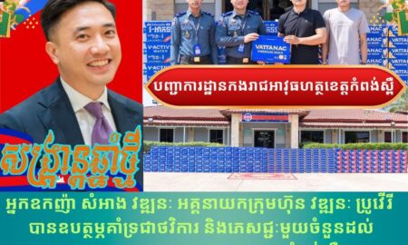 កំពង់ស្ពឺ៖ អ្នកឧកញ៉ា សំអាង វឌ្ឍនៈ អគ្គនាយកក្រុមហ៊ុន វឌ្ឍនៈ ប្រូវើរី បានឧបត្ថម្ភគាំទ្រ សម្ភារះជាភេសជ្ជៈមួយចំនួនដល់ បញ្ជាការដ្ឋានកងរាជអាវុធហត្ថខេត្តកំពង់ស្ពឺ ក្នុងឱកាសអបអរសាទរពិធីបុណ្យចូលឆ្នាំថ្មី ប្រពៃណីជាតិខ្មែរ -មហាសង្រ្កាន្ត នាពេលខាងមុខ។ ដោយបានការអនុញ្ញាតពី លោកឧត្តមសេនីយ៍ត្រី ម៉េង ស្រ៊ុន មេបញ្ជាការ កងរាជអាវុធហត្ថខេត្តកំពង់ស្ពឺ កាលថ្ងៃទី២៨ ខែមីនា...