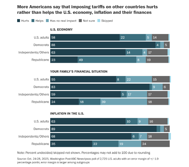 Economists warn that the full impact of tariff policies could take months to materialize, causing unease among many business owners and households. Polls show that over 60% of Americans believe tariffs will exacerbate inflation. Nearly 60% of Americans believe tariffs have harmed the U.S. economy.
