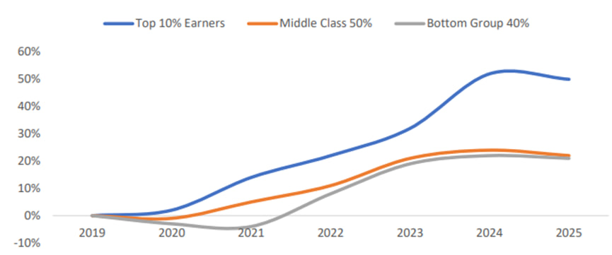 For the bottom 80% of households, spending growth barely kept pace with inflation. Many shifted from credit to debit, cut discretionary purchases, and attempted to rebuild savings. Credit card and auto loan delinquencies surpassed pre-pandemic levels. From Q4 2024 delinquencies increased significantly to record high levels. CNN recently reported, citing Bank of America data, that over the past year wage growth for middle-income households was just 2.3%, while low-income households saw gains of only 1.4%.