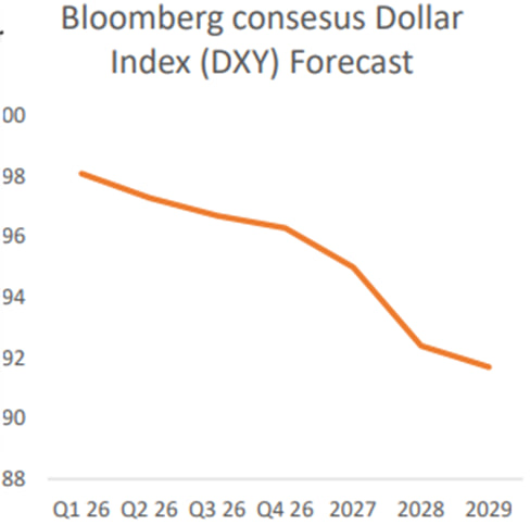Fundamentally, confidence on U.S. economic prosperity is weakening, eroding what underpins US Treasury attractiveness. Professional forecasters in the Blue Chip survey expect 1.9% GDP growth in 2026.