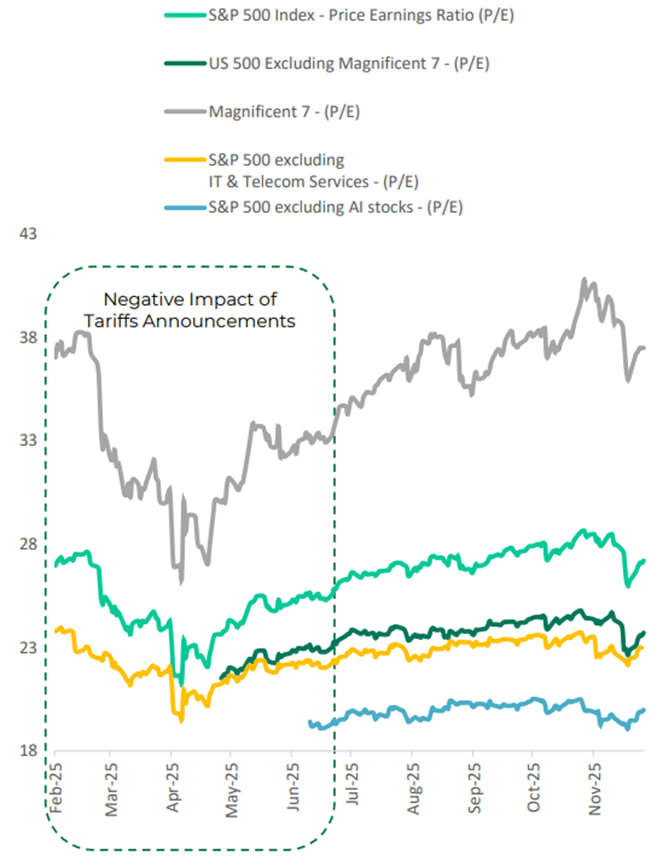 Overall, U.S. stocks added 16% on a price return basis in 2025, with gains majorly dominated by the “Magnificent 7” companies (Apple, Microsoft, Alphabet, Amazon, Nvidia, Meta, and Tesla), which made up about one-third of the entire market’s value.
