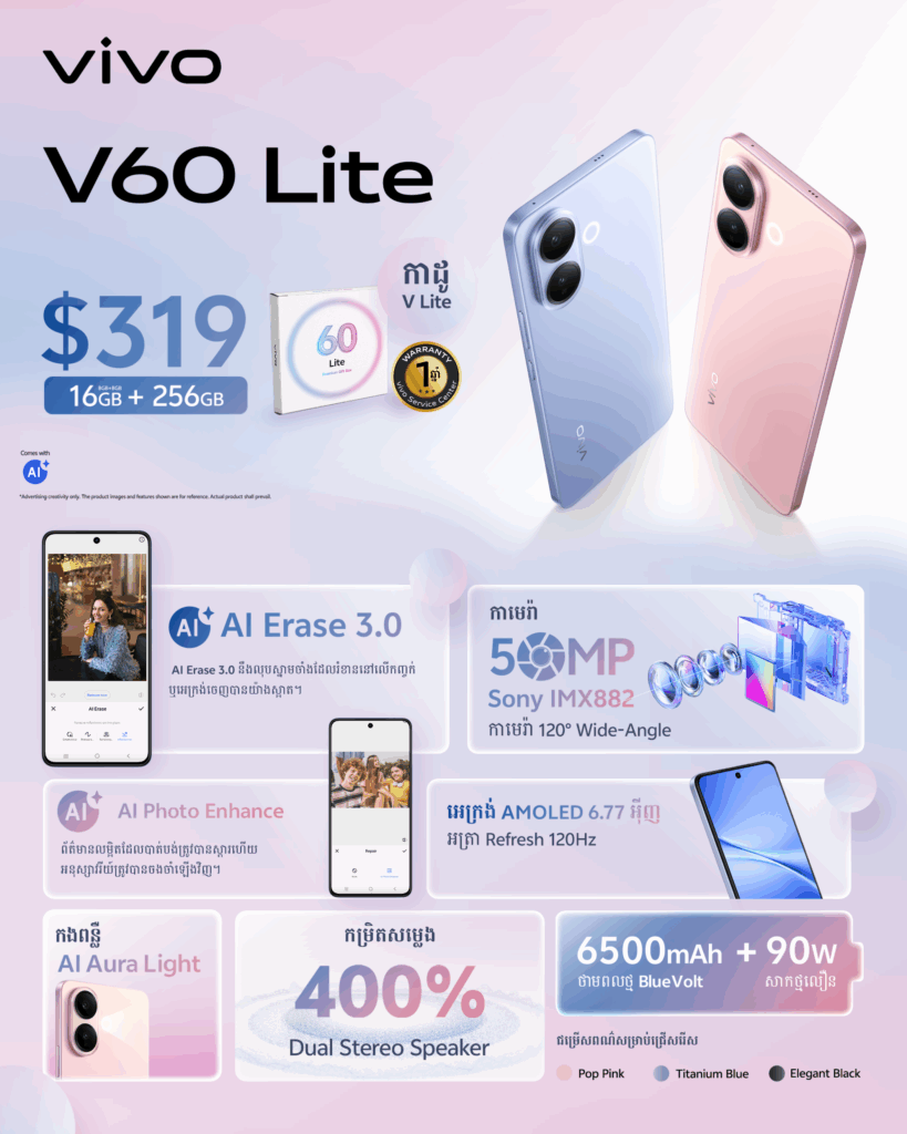 កម្ពុជា ខែវិចិ្ឆកា ឆ្នាំ២០២៥ — ក្រុមហ៊ុន vivo បានប្រកាសចេញផ្សាយស្មាតហ្វូន V60 Lite និងបើកលក់ជាផ្លូវការ ដើម្បីបង្កើតបទពិសោធន៍កម្សាន្តគ្មានដែនកំណត់ថ្មី លើទូរស័ព្ទដៃ V60 Lite ។ V60 Lite ត្រូវបានរចនាឡើងជាមួយពណ៌ Pop Pink, Titanium Blue និង Elegant Black ដែលផ្តល់អេក្រង់ច្បាស់ល្អ ការថតរូបមានគុណភាពខ្ពស់ ប្រើប្រាស់ដោយរលូន និងមានថាមពលថ្មយូរអង្វែង សម្រាប់ការកម្សាន្តដោយគ្មានដែនកំណត់ ក្នុងតម្លៃតែ 319$ ។