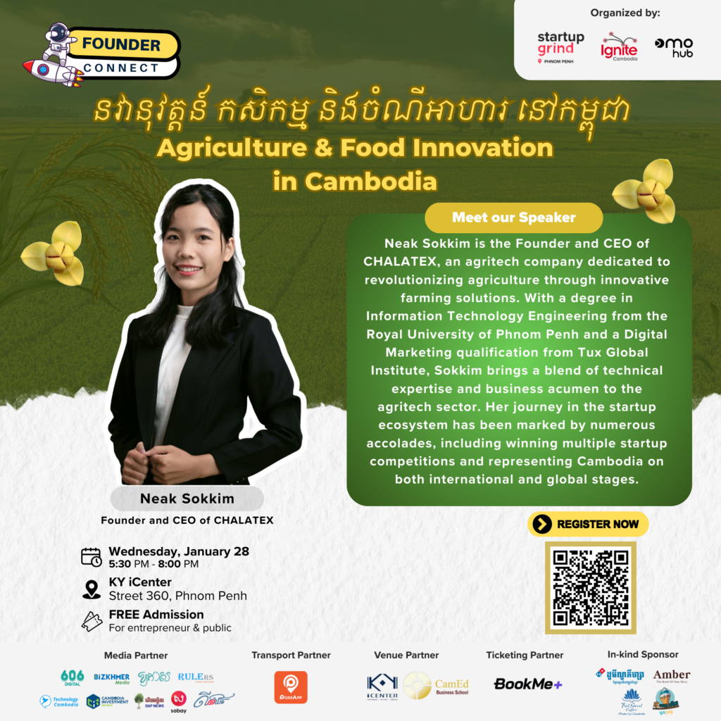 ភ្នំពេញ ៖ Startup Grind Cambodia មានសេចក្តីសោមនស្សរីករាយក្នុងការរៀបចំកម្មវិធី Founder Connect នាពេលខាងមុខនេះក្រោមប្រធានបទ “នវានុវត្តន៍ កសិកម្ម​ និងចំណីអាហារ​ នៅកម្ពុជា” ដែលនឹងប្រព្រឹត្តទៅនៅ​ ថ្ងៃច័ន្ទ ទី 28 ខែ មករា ឆ្នាំ 2026 ពីម៉ោង 5:30 PM ដល់ 8:00 PM នៅ KY iCenter។