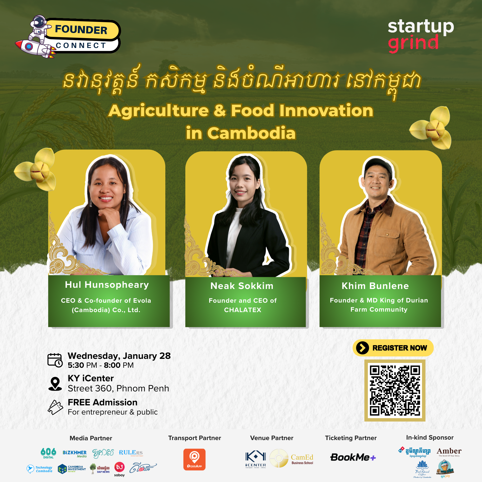 ភ្នំពេញ ៖ Startup Grind Cambodia មានសេចក្តីសោមនស្សរីករាយក្នុងការរៀបចំកម្មវិធី Founder Connect នាពេលខាងមុខនេះក្រោមប្រធានបទ “នវានុវត្តន៍ កសិកម្ម​ និងចំណីអាហារ​ នៅកម្ពុជា” ដែលនឹងប្រព្រឹត្តទៅនៅ​ ថ្ងៃច័ន្ទ ទី 28 ខែ មករា ឆ្នាំ 2026 ពីម៉ោង 5:30 PM ដល់ 8:00 PM នៅ KY iCenter។