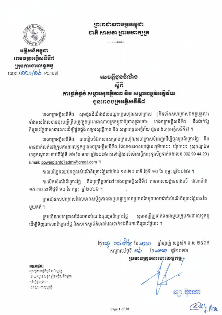 event សេចក្ដីជូនដំណឹង ស្ដីពីការផ្គត់ផ្គង់ សម្ភារសុវត្ថិភាព និងសម្ភារពន្លត់អគ្គិភ័យ ជូនរោងចក្រអគ្គិសនីទី៧ By KD102 Posted on January 26, 2026 Related Items: