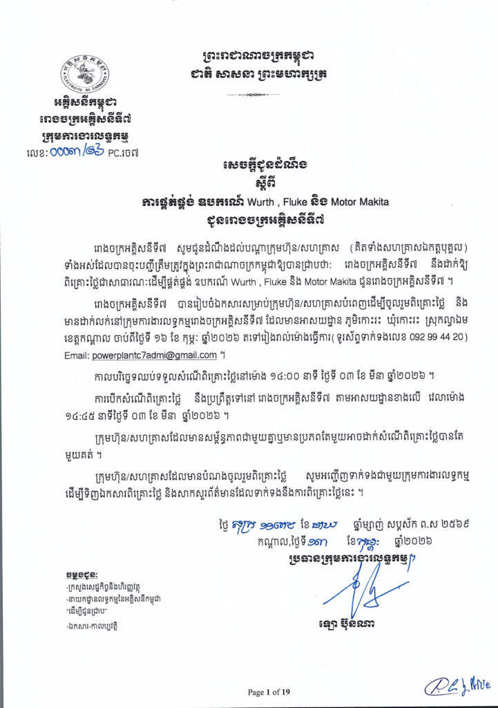 event សេចក្ដីជូនដំណឹង ស្ដីពីការផ្គត់ផ្គង់ ឧបករណ៍ Wurth , Fluke និង Motor Makita ជូនរោងចក្រអគ្គិសនីទី៧ By KD102 Posted on February 16, 2026 Related Items: