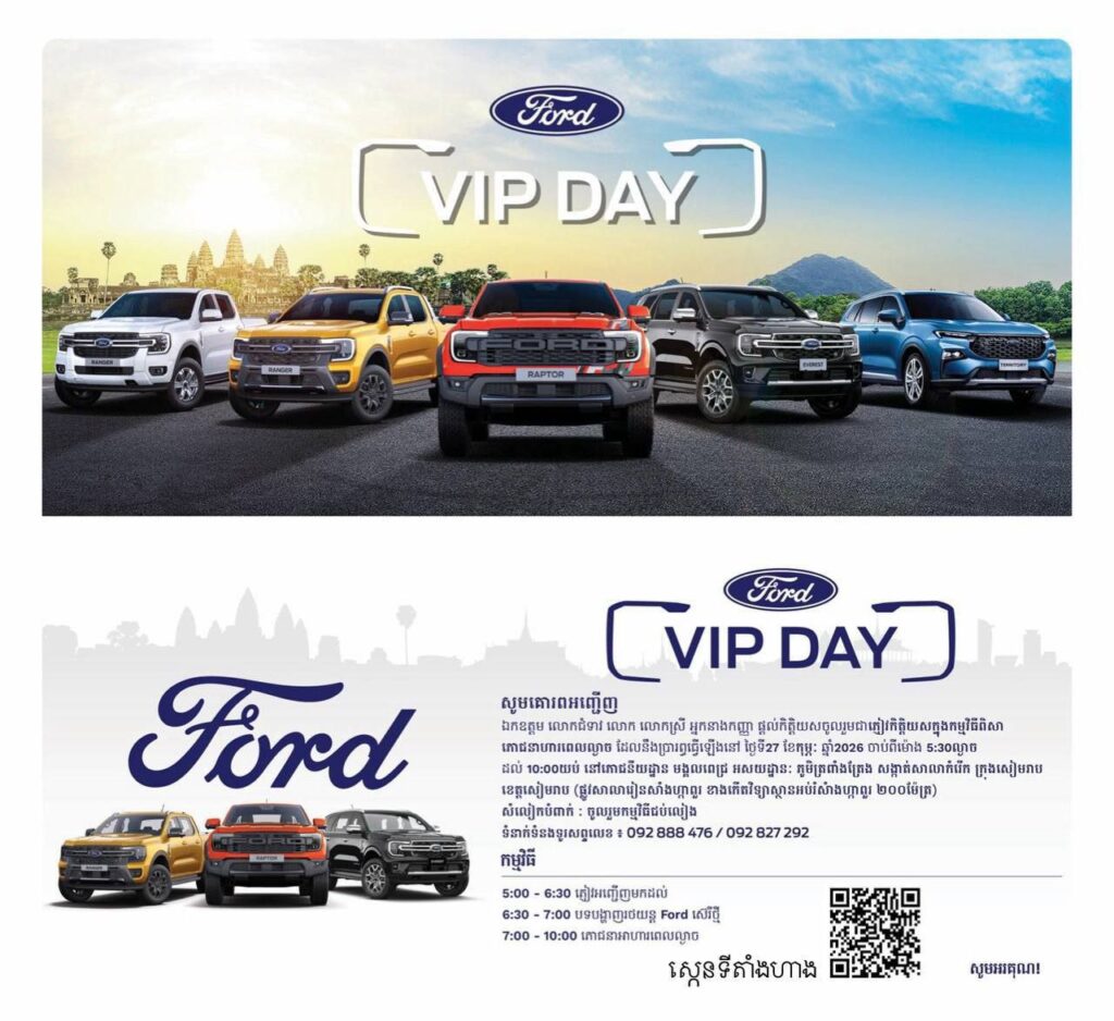 ខេត្តសៀមរាប៖ សូមស្វាគមន៍ Ford VIP DAY សូមគោរពអញ្ជើញ លោក លោកស្រី ចូលរួមជាភ្ញៀវកិត្តិយស ក្នុងកម្មវិធីពិសាអាហារជប់លាង ពេលល្ងាច ដែលនឹងប្រព្រឹត្តទៅនៅថ្ងៃទី២៧ ខែកុម្ភះ ឆ្នាំ២០២៦ ចាប់ពីម៉ោង ៥:៣០នាទីល្ងាច ដល់ម៉ោង ១០:០០នាទីយប់ នៅភោជនីយដ្ឋាន មង្គលពេជ្រ ដែលមានទីតាំងនៅ ភូមិត្រពាំងត្រែង សង្កាត់សាលាកំរើក ក្រុងសៀមរាបខេត្តសៀមរាប។ ជាពិសេសថែមទាំងមានការដាក់បង្ហាញ នូវរថយន្តស៊េរីទំនើបៗម៉ូឌែលចុងក្រោយ ជូនដល់អតិថិជនឲ្យទស្សនា និងមានការធ្វើបទបង្ហាញទៅលើរថយន្តផ្ទាល់តែម្ដង។