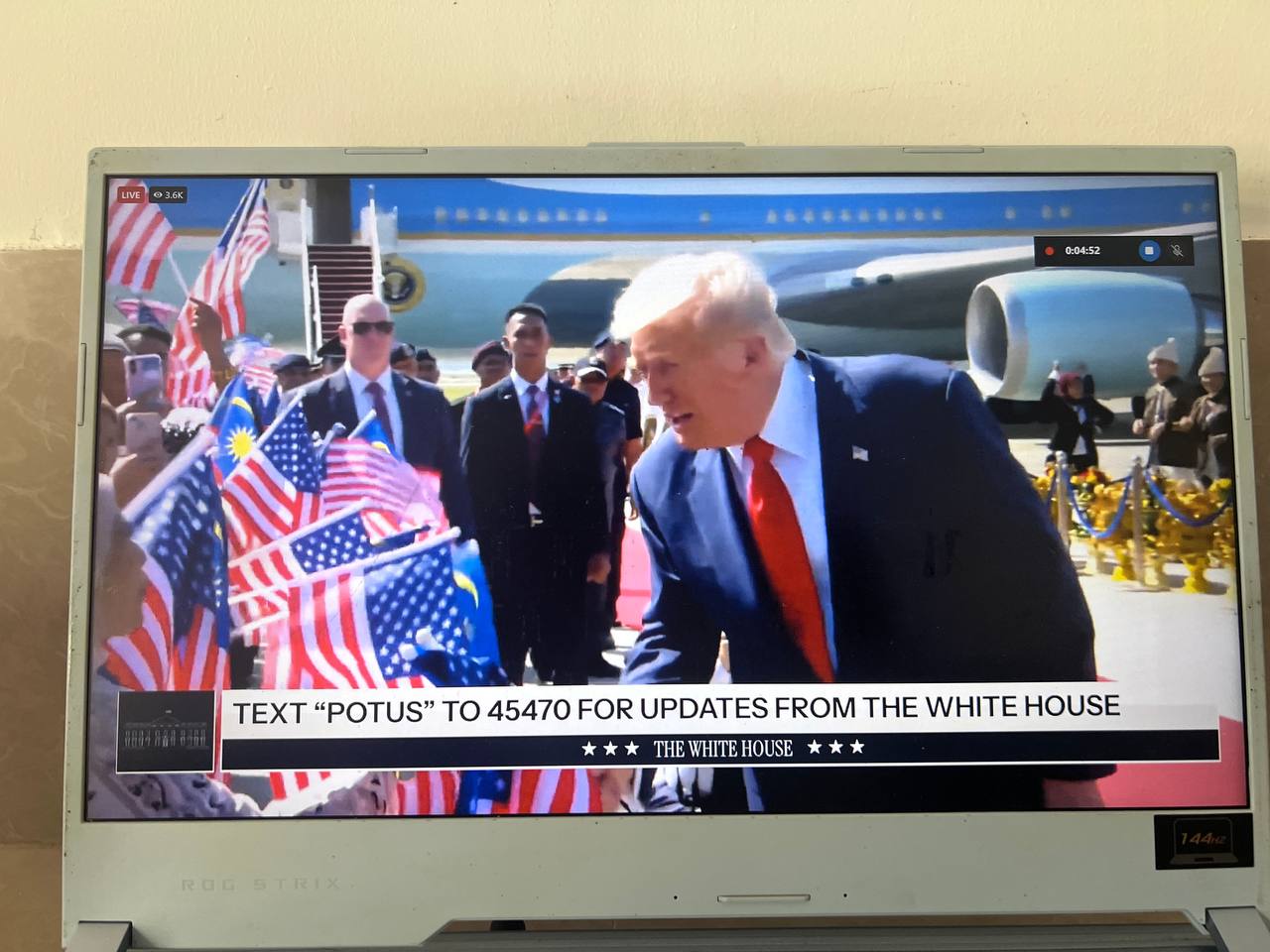 ម៉ាឡេស៊ី៖ លោក ដូណាល់ ត្រាំ ប្រធានាធិបតីអាមេរិក បានធ្វើដំណើរដល់ប្រទេសម៉ាឡេស៉ីហើយ ដើម្បីចូលរួមកិច្ចប្រជុំអាស៊ាន និងអញ្ជើញជាអធិបតី នៃពិធីចុះកិច្ចព្រមព្រៀងសន្តិភាព កម្ពុជា-ថៃ។