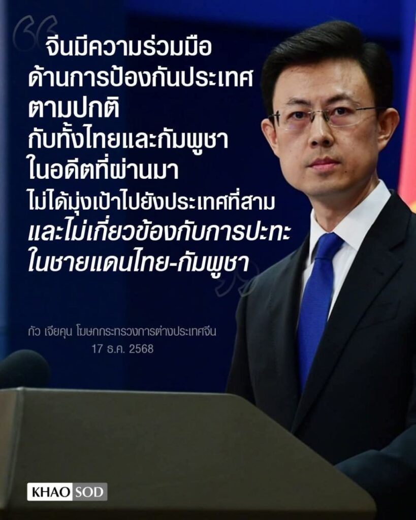 យោងតាមសារព័ត៌មាន Khaosod English ចេញផ្សាយនៅល្ងាចថ្ងៃទី១៧ ខែធ្នូ ឆ្នាំ២០២៥ថា នៅថ្ងៃទី១៧ ខែធ្នូនេះ អ្នកនាំពាក្យក្រសួងការបរទេសចិន បានឆ្លើយតបនឹងសំណួររបស់អ្នកសារព័ត៌មានទាក់ទងនឹងស្ថានភាពព្រំដែនកម្ពុជា-ថៃ ក្នុងសន្និសីទសារព័ត៌មានជាប្រចាំរបស់ក្រសួង។