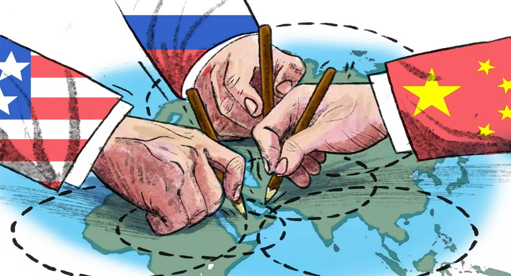 ពិភពលោកបាននឹងកំពុងត្រូវបានបែងចែក ទៅជាតំបន់ឥទ្ធិពល (Sphere of influence) ដោយនិយមន័យអ្វីទៅដែលហៅថា តំបន់ឥទ្ធិពល! ដែរពិភពលោកមើលទៅប្រៀបដូចជាសង្កាត់មួយដ៏ធំដែលពីដើមឡើយ សង្កាត់មួយនេះត្រូវបានស្ថិតនៅក្រោមច្បាប់រួមដើម្បីជាការគ្រប់គ្រង(តាមរយៈអង្គការសហប្រជាជាតិ) ។ ក៏ប៉ុន្តែឥឡូវនេះ មានគ្រួសារបីធំ ខ្លាំងហើយមានទ្រព្យធនច្រើនបានឯកភាពកំណត់សម្រេចថា៖ ក្នុងគ្រួសារអ្នកមានធំ និងខ្លាំងមួយនេះមានសិទ្ធិ ធ្វើការគ្រប់គ្រងមកលើផ្ទះប៉ុន្មានខ្នងដាច់ដោយឡែកពីគ្នាដោយ៖