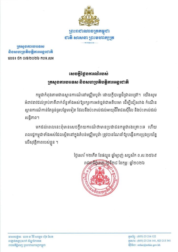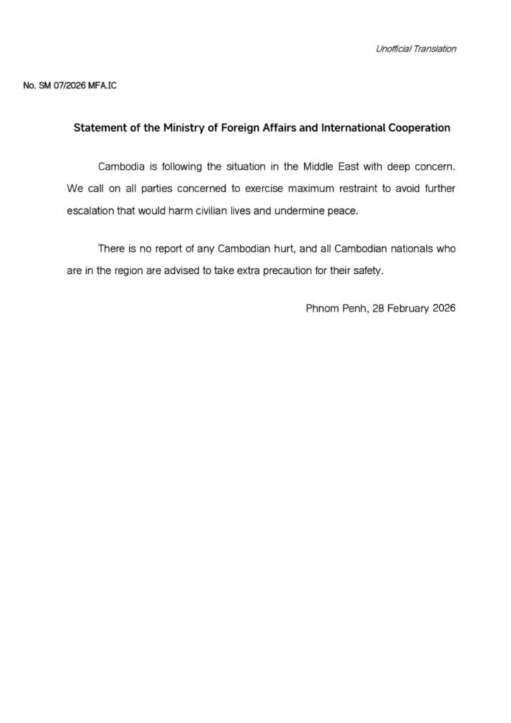 កម្ពុជា កំពុងតាមដានស្ថានការណ៍នៅមជ្ឈិមបូព៌ា ដោយក្តីបារម្ភដ៏ជ្រាលជ្រៅ។ យើងសូម អំពាវនាវដល់គ្រប់ភាគីពាក់ព័ន្ធទាំងអស់ឱ្យរក្សាការអត់ធ្មត់ជាអតិបរមា ដើម្បីជៀសវាង កំណើន ស្ថានការណ៍កាន់តែធ្ងន់ធ្ងរបន្ថែមទៀត ដែលនឹងប៉ះពាល់ដល់អាយុជីវិតជនស៊ីវិល និងប៉ះពាល់ដល់សន្តិភាព។