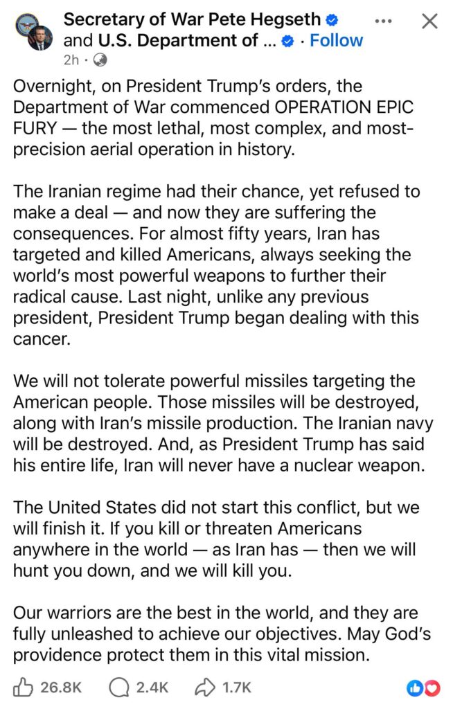 ពេញមួយយប់ តាមបញ្ជារបស់ប្រធានាធិបតី Trump ក្រសួងសង្គ្រាមបានចាប់ផ្តើមប្រតិបត្តិការ EPIC FURY — ប្រតិបត្តិការផ្លូវអាកាសដ៏សាហាវបំផុត ស្មុគស្មាញបំផុត និងមានភាពជាក់លាក់បំផុតក្នុងប្រវត្តិសាស្ត្រ។