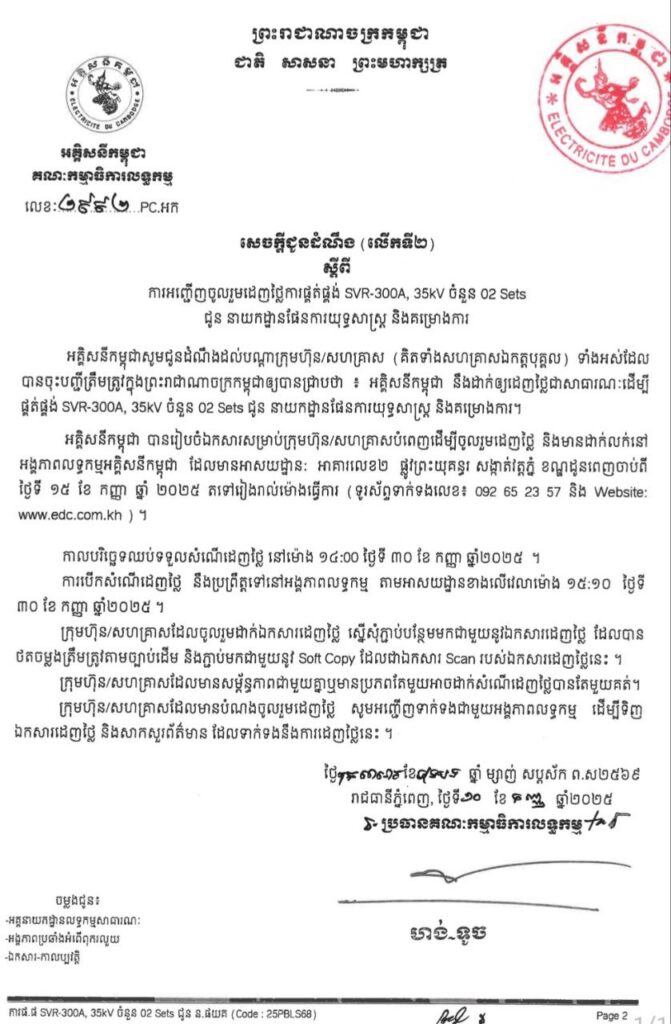 អគ្គិសនីកម្ពុជា នឹងដាក់ឲ្យដេញថ្លៃ (លេីកទី២) ការផ្គត់ផ្គង់ SVR-300A, 35kV ចំនួន 02 Sets ជូន នាយកដ្ឋានផែនការយុទ្ធសាស្ត្រ និងគម្រោងការ