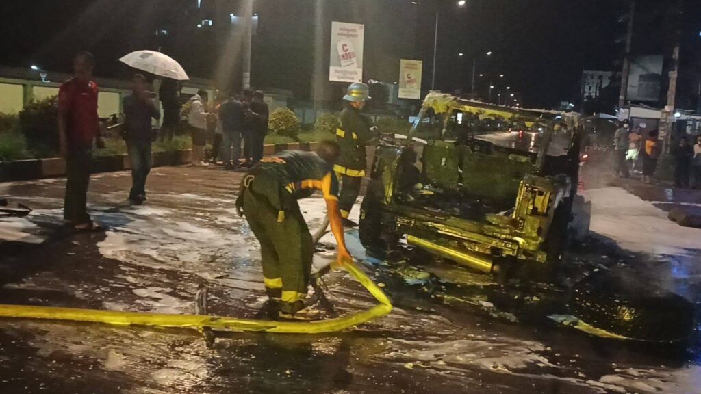 ភ្នំពេញ ៖ នៅវេលាម៉ោង០២:៣០នាទី រំលងអាធ្រាត្រ ថ្ងៃទី២៥ ខែកញ្ញា ឆ្នាំ២០២៥ មានករណីអគ្គិភ័យឆេះនៅចំណុចផ្លូវ North Bridge កែងផ្លូវ២០០៤ រវាងរថយន្តម៉ាក Prius នឹងរថយន្តម៉ាក Jeep ស្ថិតក្នុងសង្កាត់អូបែកក្អម ខណ្ឌសែនសុខ រាជធានីភ្នំពេញ ។