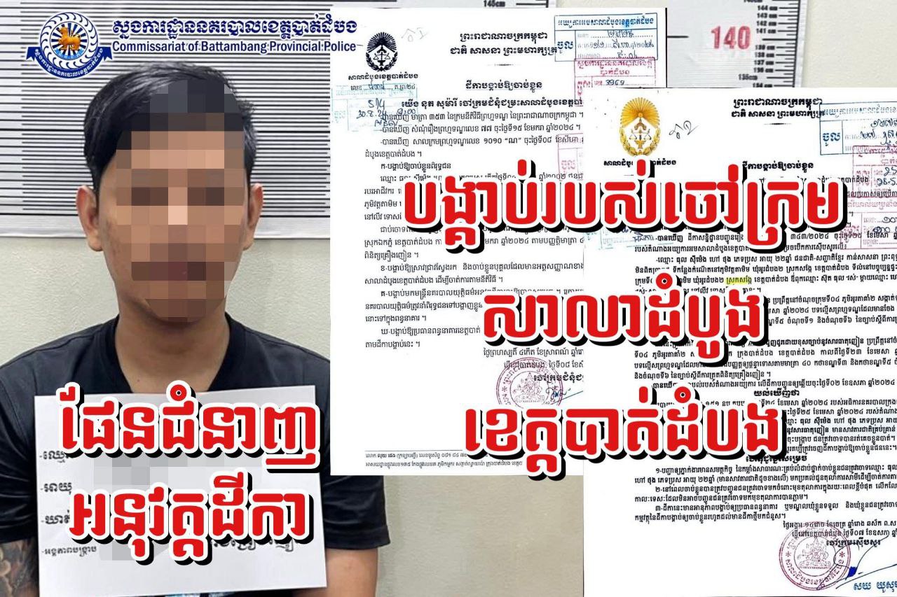 ភ្នំពេញ ៖ កាលពីថ្ងៃទី២៧ ខែកញ្ញា ឆ្នាំ២០២៥ សមត្ថកិច្ចនគរបាលបានបញ្ជូនពិរុទ្ធជន ម្នាក់ឈ្មោះធុល ស៊ីម៉េង ហៅថុល ភេទប្រុស អាយុ៣២ឆ្នាំរស់​នៅភូមិវត្តតាមិម ឃុំអូរដំបង១ ស្រុកសង្កែ ខេត្តបាត់ដំបងទៅសាលាដំបូង ខេត្តបាត់ដំបង បន្ទាប់ពីបានអនុវត្តដីកាបង្គាប់ របស់ចៅក្រមចំនួន០២ ដីកាក្នុងអំពើល្មើសគ្រឿងញៀន ក្នុងមូលដ្ឋាន នាពេលកន្លងមករបស់ពិរុទ្ធជនខាងលើ។