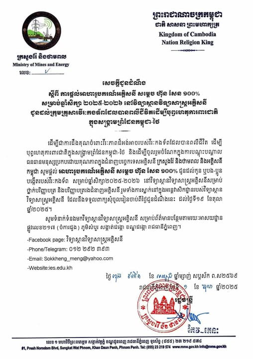 ក្រសួងរ៉ែ និងអគ្គិសនីកម្ពុជា ផ្តល់អាហារូបករណ៍អគ្គិសនី សម្តេច ហ៊ុន សែន ១០០% សម្រាប់ឆ្នាំសិក្សា ២០២៥-២០២៦ នៅវិទ្យាស្ថាន វិទ្យាសាស្ត្រអគ្គិសនី ជូនដល់ក្រុមគ្រួសារវីរៈកងទ័ព ដែលបានរាលីជីវិត ដើម្បីបុព្វហេតុការពារជាតិ ក្នុងសង្គ្រាម ព្រំដែនកម្ពុជា-ថៃ