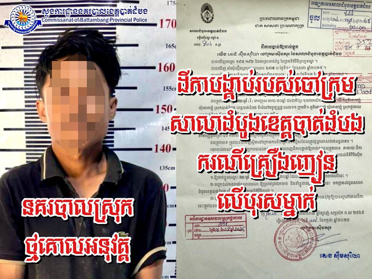 បាត់ដំបង ៖​ ពីថ្ងៃទី ០២ ខែ តុលា ឆ្នាំ២០២៥ វេលាម៉ោង ១៦ និង ៤០ នាទី នៅចំណុចវាលស្រែក្រុមទី ០១ ភូមិ គោកឃ្មុំ ឃុំ គោកឃ្មុំ ស្រុក ថ្មគោល ខេត្តបាត់ដំបង ស្របតាមអនុសាសន៍ដ៏ខ្ពង់ខ្ពស់របស់ឯកឧត្តម​ នាយឧត្តមសេនី​យ៍​ ស​ ថេត​ អគ្គស្នងការនគរ​បាល​ជាតិ​ និងការចង្អុលដឹកនាំរបស់ លោកឧត្តមសេនីយ៍ទោ​ ដាញ់​ អេងប៊ុន ចាន់​ ស្នងការនៃ​ស្នងការដ្ឋាននគរបាលខេត្តបាត់ដំបង​ លោកវរសេនីយ៍ឯក​ សេង​ លុច​ អធិការនគរបាល ស្រុកថ្មគោល​ ដឹកនាំកម្លាំងអនុវត្តដីកាបង្គាប់ឱ្យច-ាប់ខ្លួន របស់ចៅក្រមស៊ើបសួរនៃសាលាដំបូង ខេត្តបាត់ដំបង ចាប់ ខ្លួនឈ្មោះ វយ បូរី (ហៅ រី) ភេទប្រុស អា យុ ៣០ ឆ្នាំ រស់នៅក្រុមទី ០១ ភូមិ គោកឃ្មុំ ឃុំ គោកឃ្មុំ ស្រុកថ្មគោល ខេត្តបាត់ដំបងជាប់ ចោទពីបទ ជួញដូរ ដោយខុសច្បានប់ នូវសារធាតុញៀន ប្រព្រឹត្តនៅចំណុចភូមិ គោកឃ្មុំ ឃុំ គោកឃ្មុំ ស្រុកថ្មគោល ខេត្តបាត់ដំបង កាលពីថ្ងៃទី០៨ ខែឧសភា ឆ្នាំ២០២៥ ។
