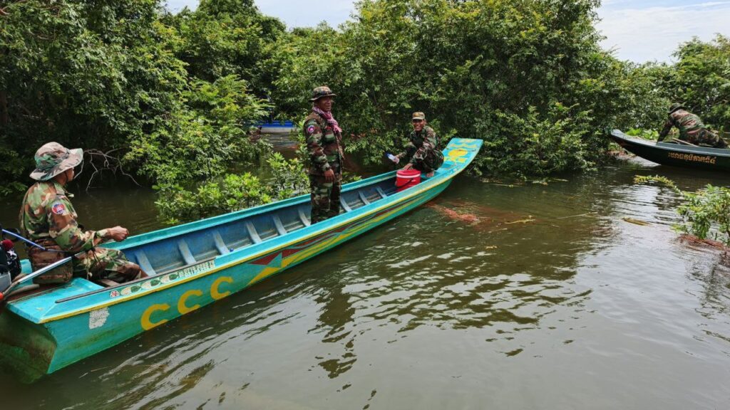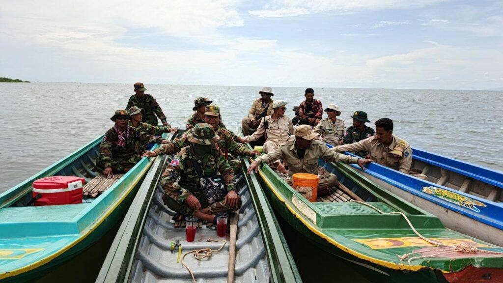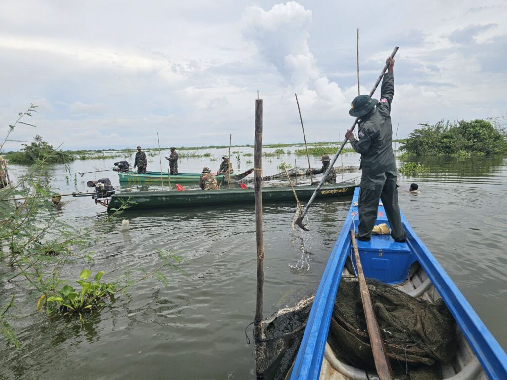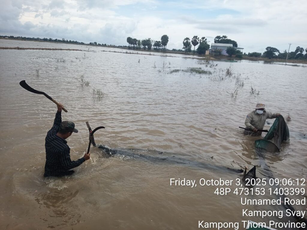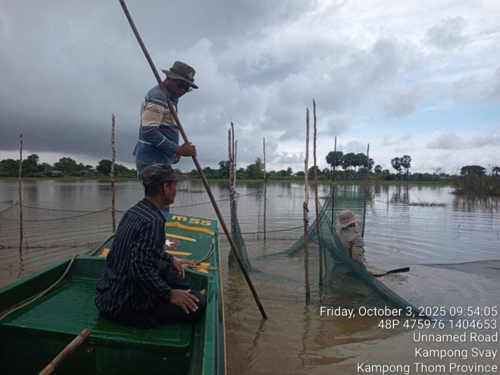 កំពង់ធំ៖ លោក ជិន ស៊ីថា នាយខណ្ឌរដ្ឋបាលជលផលកំពង់ធំ អធិការដ្ឋានរដ្ឋបាលជលផលខាងជើងបឹងទន្លេសាប និងសង្កាត់រដ្ឋបាលជលផលកំពង់ស្វាយលើ បានដឹកនាំកម្លាំង មន្រ្តីខណ្ឌជលផលកំពង់ធំ និងមន្ត្រីជាប់កិច្ចសន្យា និងគណៈកម្មការសហគមន៍នេសាទសាមគ្គីកំពង់គោ សហការជាមួយកម្លាំងទីបញ្ជាការស្រាល ចុះទប់ស្កាត់ និងបង្ក្រាបបទល្មើសជលផលនៅចំណុច: អូរតាសេក,ចុងអូរឡោ ក្នុងភូមិសាស្រ្តឃុំកំពង់គោ ស្រុកកំពង់ស្វាយ ខេត្តកំពង់ធំ នៅថ្ងៃទី០៣ ខែតុលា ឆ្នាំ២០២៥។