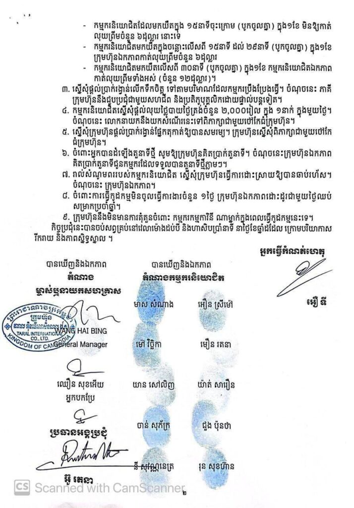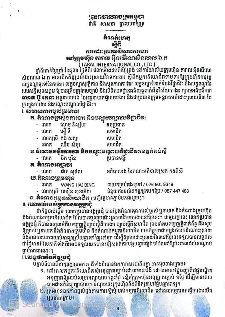 ក្រសួងការងារ ចេញសេចក្តីប្រកាសព័ត៌មាន ស្តីពីលទ្ធផល នៃការដោះស្រាយករណីកម្មករនិយោជិត នៃក្រុមហ៊ុន តារាល អ៊ិនធើណេសិនណល ឯ.ក ធ្វើការប្រមូលផ្តុំតវ៉ា រហូតឈានដល់ការបិទផ្លូវសាធារណៈ (ផ្លូវជាតិលេខ៣)