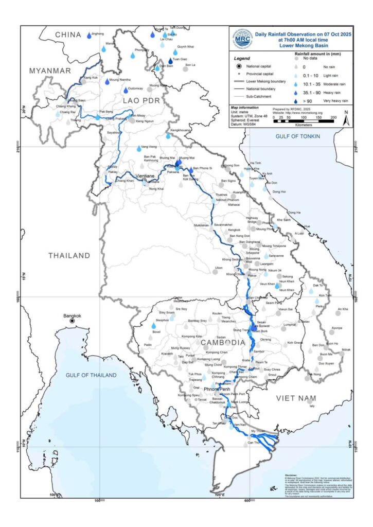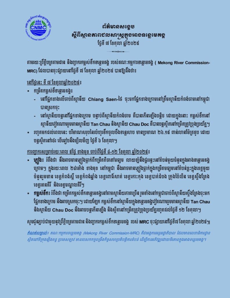 សម្រាប់កម្ពស់ទឹកទន្លេមេគង្គ នៅតាមស្ថានីយភាគច្រើន រួមទាំងនៅកម្ពុជាចាប់ពីស្ថានីយស្ទឹងត្រែង ចុះមកផ្នែកខាងក្រោម នឹងអាចស្រកចុះ។ ដោយឡែក កម្ពស់ទឹកនៅស្ថានីយក្នុងទន្លេមេគង្គវៀតណាមរួមមាន ៖ ស្ថានីយ Tan Chau និងស្ថានីយ Chau Doc នឹងអាចបន្តកើនឡើង និងស្ថិតនៅកម្រិតត្រូវប្រុងប្រយ័ត្ន រហូតដល់ថ្ងៃទី១២ ខែតុលា ៕