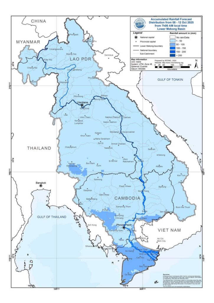 ភ្នំពេញ ៖ គណៈកម្មការទន្លេមេគង្គ បានព្យាករទុកមុន សម្រាប់រយៈពេល៥ថ្ងៃ ខាងមុខ គឺចាប់ពីថ្ងៃទី ៨-១២ ខែតុលា ឆ្នាំ២០២៥ នឹងអាចមានភ្លៀង ធ្លាក់ពីកម្រិតតិចទៅមធ្យម លាយឡំនឹងផ្គររន្ទះ នៅតំបន់មួយចំនួនក្នុងអាងទន្លេមេគង្គក្រោម ។ ក្នុងនោះក្នុងរយៈពេល ២៤ម៉ោង ខាងមុខ នៅកម្ពុជា នឹងអាចមានភ្លៀងធ្លាក់ក្នុងកម្រិតមធ្យមនៅតំបន់ខ្លះ ក្នុងខេត្តមួយ ចំនួនរួមមាន ខេត្តកំពង់ស្ពឺ ខេត្តកំពង់ឆ្នាំង ខេត្តពោធិ៍សាត់ ខេត្តកោះកុង ខេត្តបាត់ដំបង ក្រុងប៉ៃលិន ខេត្តស្ទឹងត្រែង ខេត្តរតនគិរី និងខេត្តមណ្ឌលគិរី ។