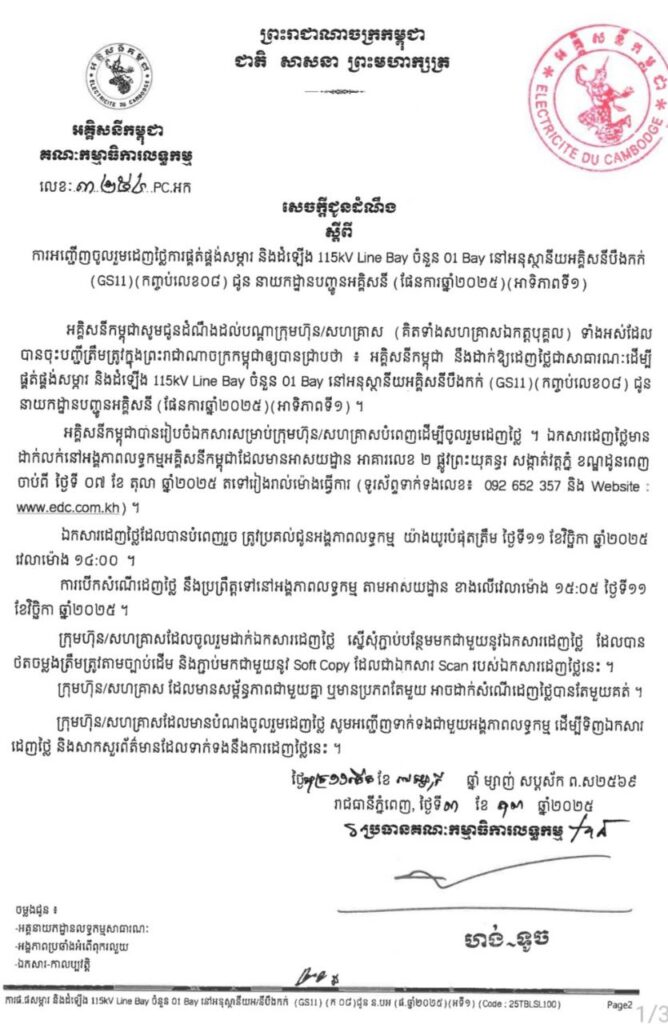 ភ្នំពេញ ៖ អគ្គិសនីកម្ពុជា សូមជូនដំណឹងដល់បណ្តាក្រុមហ៊ុន/សហគ្រាស (គិតទាំងសហគ្រាស ឯកត្តបុគ្គល) ទាំងអស់ ដែលបានចុះបញ្ជីត្រឹមត្រូវ ក្នុងព្រះរាជាណាចក្រកម្ពុជា ឲ្យបានជ្រាបថា ៖ អគ្គិសនីកម្ពុជា នឹងដាក់ឱ្យដេញថ្លៃ ជាសាធារណៈដើម្បី ផ្គត់ផ្គង់សម្ភារ និងដំឡើង 115kV Line Bay ចំនួន 01 Bay នៅអនុស្ថានីយអគ្គិសនីបឹងកក់ (GS11) (កញ្ចប់លេខ០៨) ជូន នាយកដ្ឋានបញ្ជូនអគ្គិសនី (ផែនការឆ្នាំ២០២៥) (អាទិភាពទី១) ។