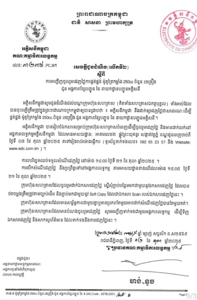 អគ្គិសនីកម្ពុជា បានរៀបចំឯកសារសម្រាប់ក្រុមហ៊ុន/សហគ្រាសបំពេញ ដើម្បីចូលរួមដេញថ្លៃ និងមានដាក់លក់នៅ អង្គភាពលទ្ធកម្មអគ្គិសនីកម្ពុជា ដែលមានអាសយដ្ឋានៈ អាគារលេខ២ ផ្លូវព្រះយុគន្ធរ សង្កាត់វត្តភ្នំ ខណ្ឌដូនពេញ ចាប់ពី ថ្ងៃទី ០៧ ខែ តុលា ឆ្នាំ២០២៥ តទៅរៀងរាល់ម៉ោងធ្វើការ (ទូរស័ព្ទទាក់ទងលេខ៖ 092 65 23 57 និង Website: www.edc.com.kh) ។