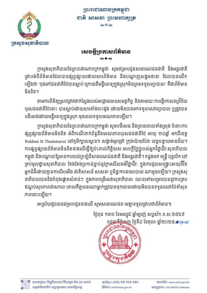 ក្រសួងសុខាភិបាល ៖ ការផ្សាយ “ចុងភៅជនជាតិថៃស្លាប់ ក្រោយពេទ្យក្នុងស្រុក មិនព្រមទទួលព្យាបាល” ជារឿងមិនពិត