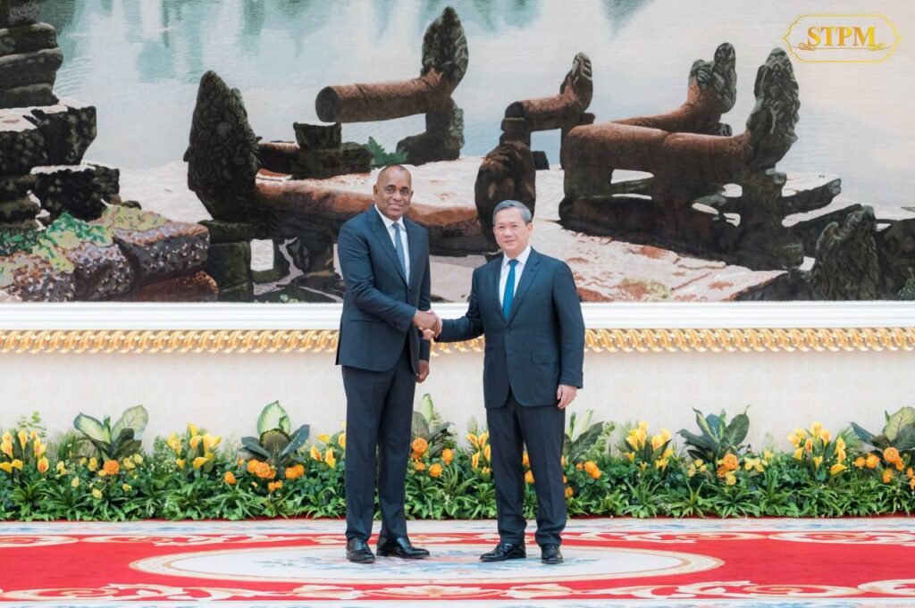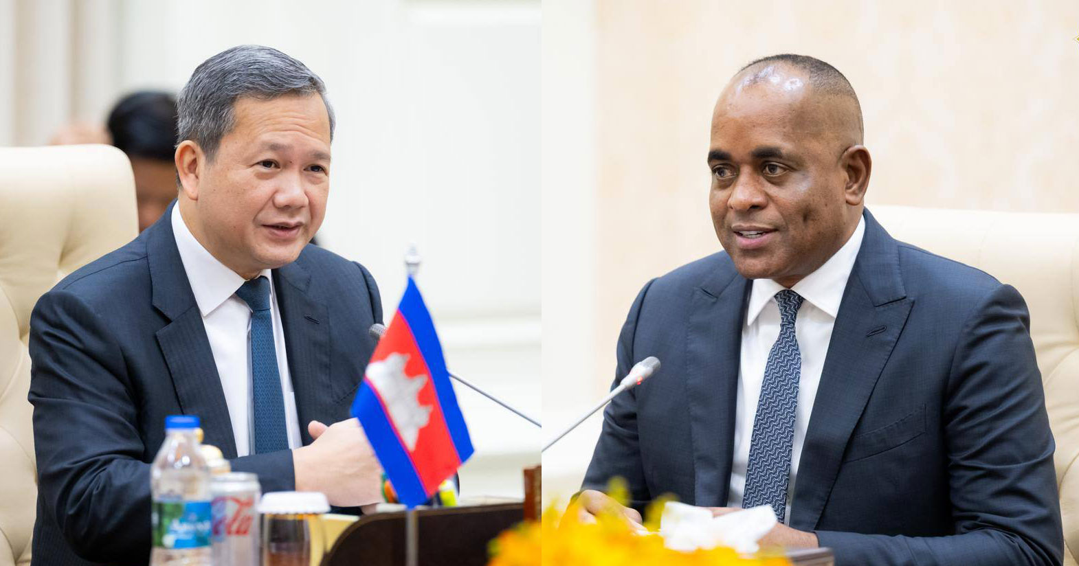 ភ្នំពេញ ៖ សម្តេចមហាបវរធិបតី ហ៊ុន ម៉ាណែត នាយករដ្ឋមន្ត្រី នៃព្រះរាជាណាចក្រកម្ពុជា បានអញ្ជេីញទទួលជួប សម្តែងការគួរសម និងពិភាក្សាការងារ ជាមួយលោកបណ្ឌិត Roosevelt Skerrit នាយករដ្ឋមន្ត្រីនៃកុំមិនវែលដូមីនីក នៅវិមានសន្តិភាព នៅព្រឹកថ្ងៃព្រហស្បតិ៍ ទី៩ តុលា ២០២៥។