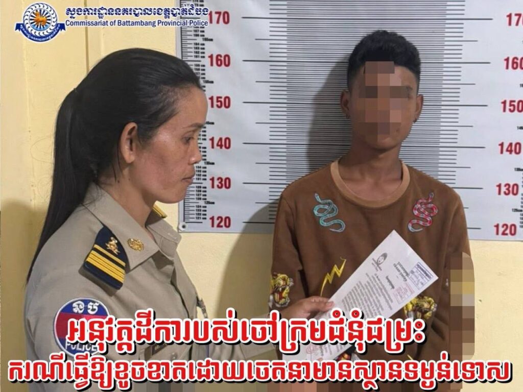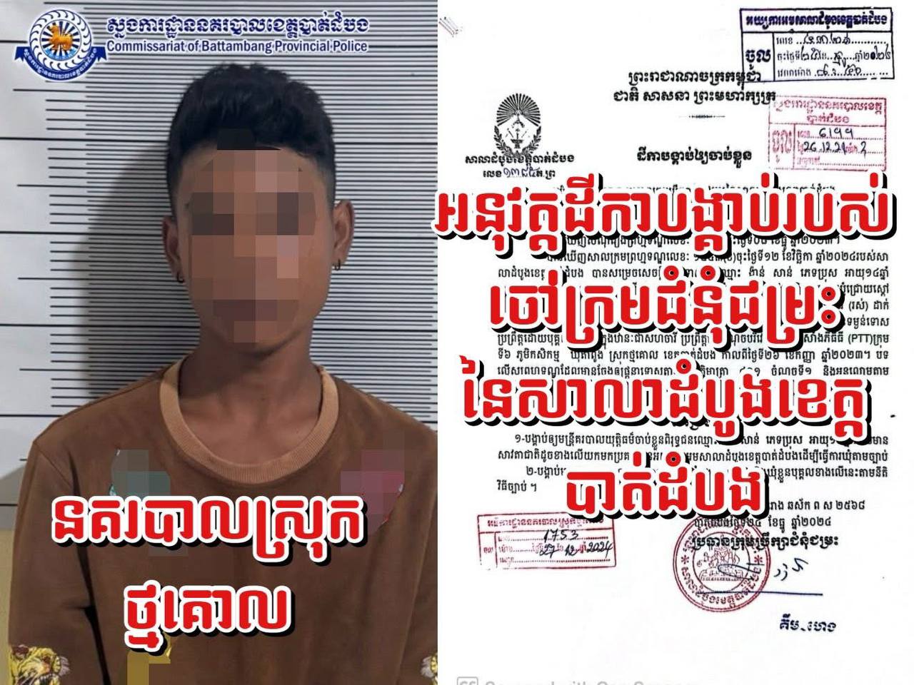 បាត់ដំបង៖​ នៅថ្ងៃទី​០៩​ ខែ​តុលា​ ឆ្នាំ២០២៥ វេលាម៉ោង​១៧និង៣០នាទី នៅចំណុចភូមិនិគមក្នុង ឃុំជ្រោយស្តៅ ស្រុកថ្មគោល ខេត្តបាត់ដំបង ស្របតាមអនុសាសន៍ដ៏ខ្ពង់ខ្ពស់របស់ឯកឧត្តម​ នាយឧត្តមសេនីយ៍​ ស​ ថេត​ អគ្គស្នងការនគរ​បាលជាតិ​ និងការចង្អុលទិសដឹកនាំរបស់លោ​ក​ ឧត្តមសេនីយ៍ទោ​ ដាញ់​ អេងប៊ុន​ចាន់​ ស្នងការនៃស្នងការដ្ឋាននគរបាលខេត្តបាត់ដំបង​ លោកវរសេនីយ៍ឯក​ សេង​ លុច​ អធិ​ការនគរ​បាលស្រុកថ្មគោល​ ដឹកនាំកម្លាំងជំនាញផ្នែកយុត្តិធម៌ សហការជាមួយប៉ុស្តិ៍នគរបាលជ្រោយស្តៅ អនុវត្តដីកាបង្គាប់ឱ្យចាប់ខ្លួន​របស់ចៅក្រមជំនុំជម្រះនៃសាលាដំបូងខេត្តបាត់ដំបងដោយច-ាប់ឈ្មោះ ង៉ាន់​ សាន់ភេទប្រុស អាយុ—ឆ្នាំ មានទីលំនៅភូមិនិគមក្នុងឃុំជ្រោយស្តៅ ស្រុកថ្មគោល ខេត្តបាត់ដំបង ជាប់ចោទពីបទ ធ្វេីឱ្យខូចខាតដោយចេតនា មានស្ថានទម្ងន់ទោស​ ប្រព្រឹ ត្តដោយបុគ្គល​ច្រេីនរូបក្នុងឋាន: ជាសហចារីប្រព្រឹត្តចំណុ​ចស្ថានីយ៍ប្រេងសាំងនៅក្រុមទី០៦​ ភូមិកសិកម្ម​ ឃុំតាពូង ស្រុកថ្មគោល ខេត្តបាត់ដំបង កាលពីថ្ងៃទី២៦ខែកញ្ញាឆ្នាំ២០២៣។