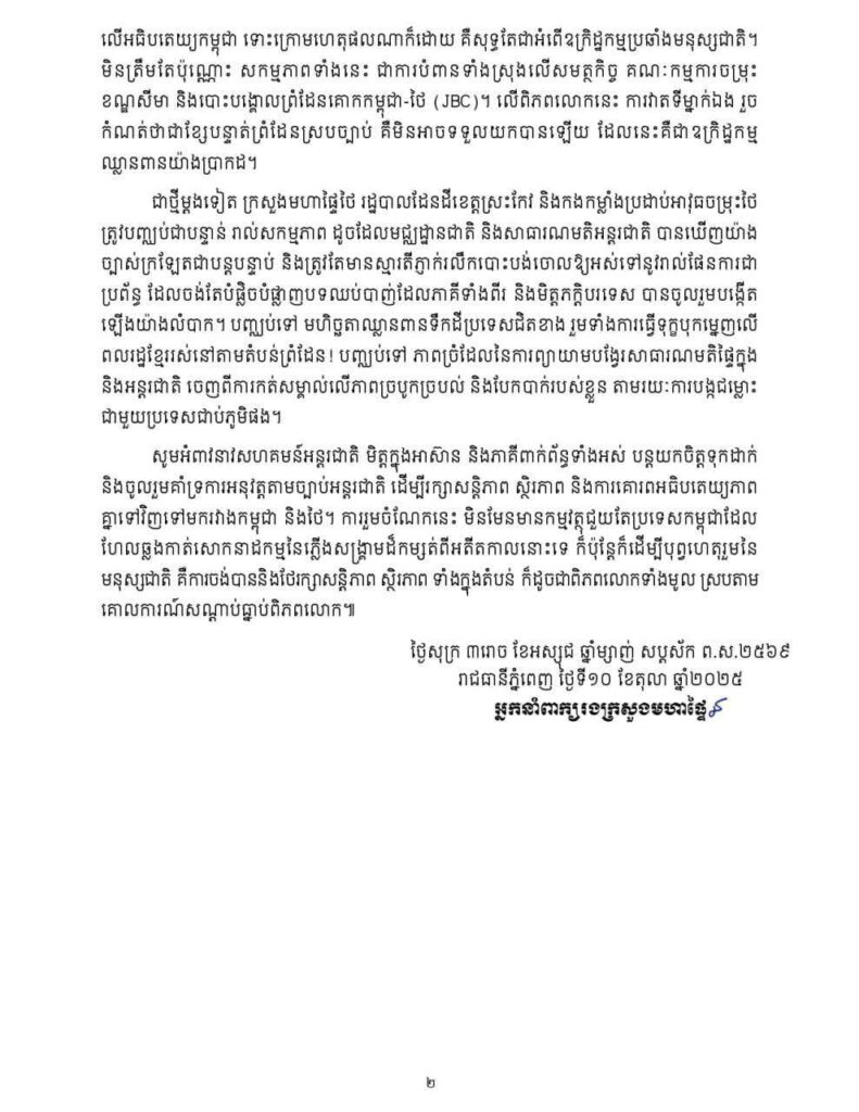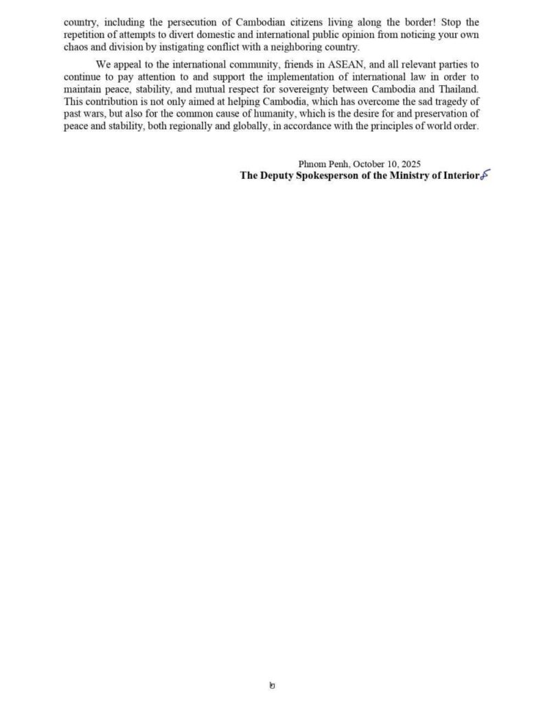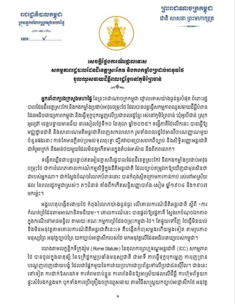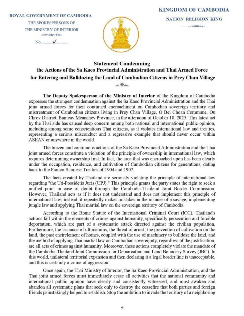 ភ្នំពេញ៖ អ្នកនាំពាក្យរងក្រសួងមហាផ្ទៃ នៃព្រះរាជាណាចក្រកម្ពុជា បានថ្កោលទោសយ៉ាងធ្ងន់ធ្ងរបំផុត ចំពោះរដ្ឋបាលដែនដីខេត្តស្រះកែវ និងកងកម្លាំងប្រដាប់អាវុធចម្រុះថៃ ដែលបានបន្តធ្វើសកម្មភាពឈូសឆាយដីធ្លី បំពានដែនអធិបតេយ្យភាពកម្ពុជា និងធ្វើទុក្ខបុកម្នេញលើប្រជាពលរដ្ឋខ្មែរ រស់នៅភូមិព្រៃចាន់ ឃុំអូរបីជាន់ ស្រុកអូរជ្រៅ ខេត្តបន្ទាយមានជ័យ នារសៀលថ្ងៃទី១០ ខែតុលា ឆ្នាំ២០២៥។