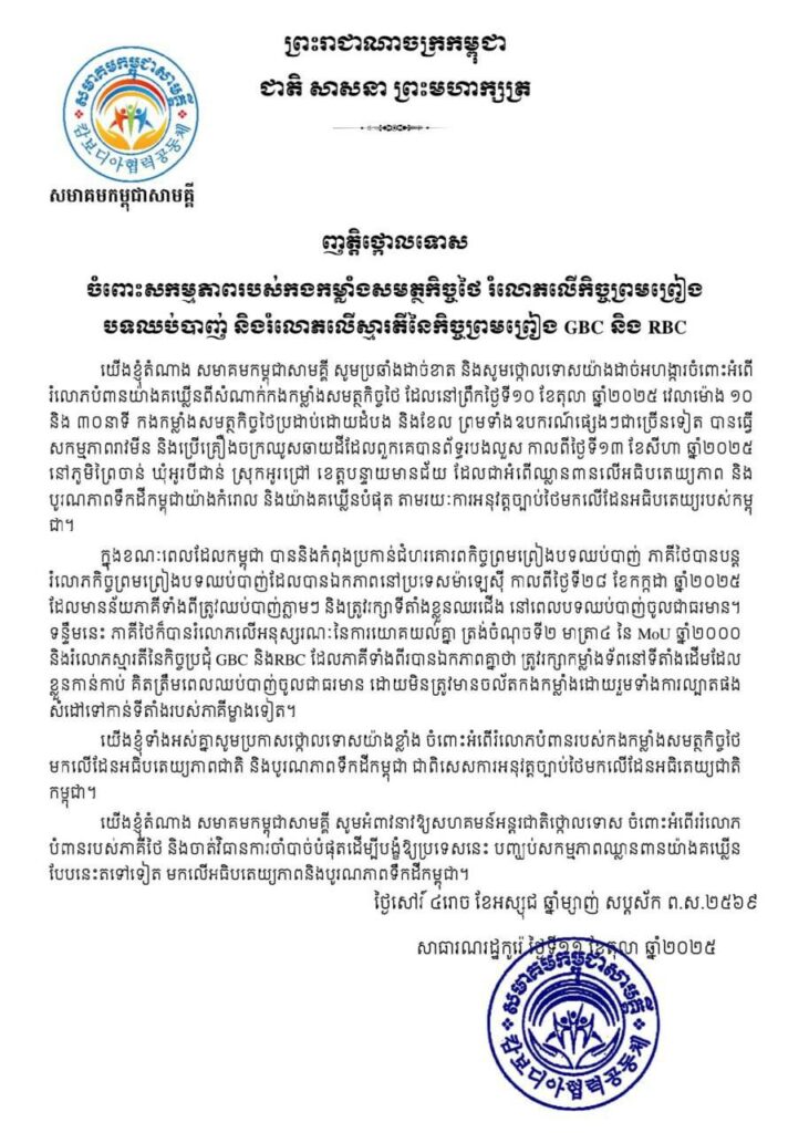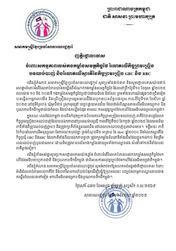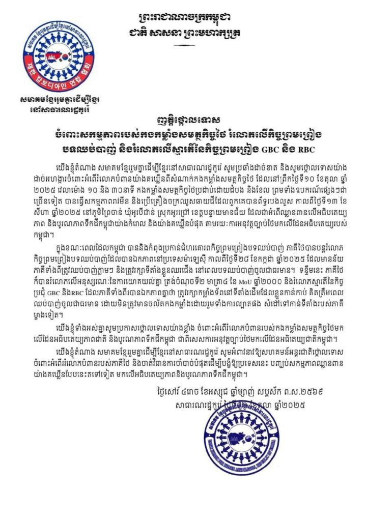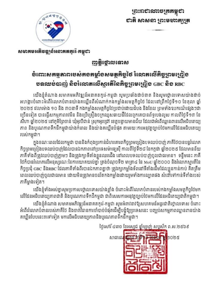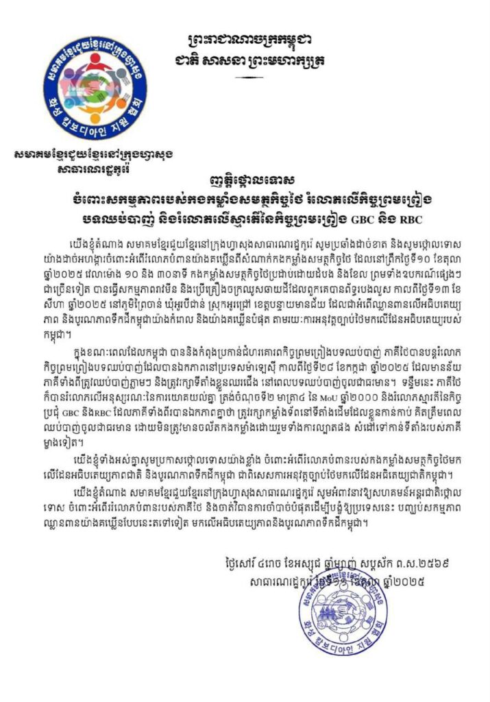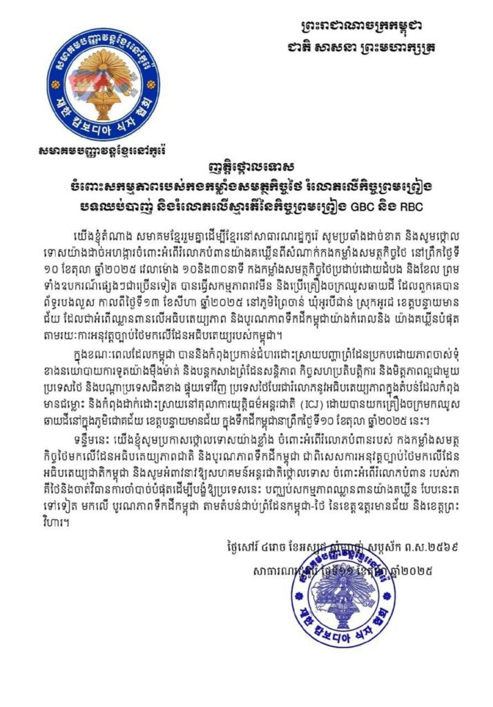 ភ្នំពេញ៖ សមាគមខ្មែរចំនួន ៦ ដែលមានមូលដ្ឋាន នៅប្រទេសកូរ៉េខាងត្បូង នៅថ្ងៃទី ១១ ខែតុលា ឆ្នាំ ២០២៥នេះ បានចេញញត្តិដាច់ដោយឡែកពីគ្នា ដោយថ្កោលទោសចំពោះសកម្មភាព របស់កងកម្លាំងសមត្ថកិច្ចថៃ ដែលបានរំលោភលើកិច្ចព្រមព្រៀងបទឈប់បាញ់ និងរំលោភលើស្មារតីនៃកិច្ចព្រមព្រៀង GBC និង RBC។