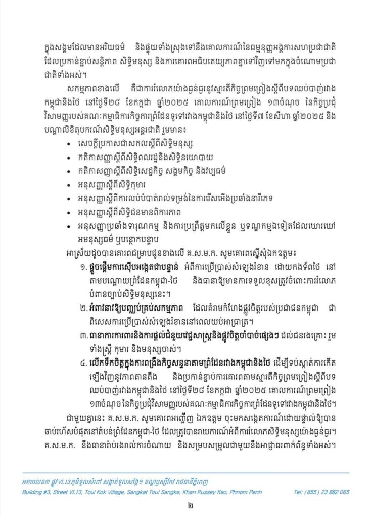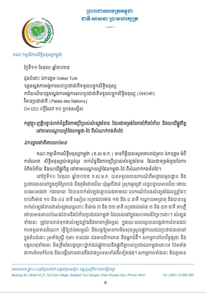 កម្ពុជា ដាក់បណ្តឹងទៅការិយាល័យឧត្តមស្នងការ អង្គការសហប្រជាជាតិ អំពីការប្រើសំឡេងរំខានរបស់យោធាថៃ មកលើប្រជាជនកម្ពុជា នៅភូមិជោគជ័យ និងព្រៃចាន់