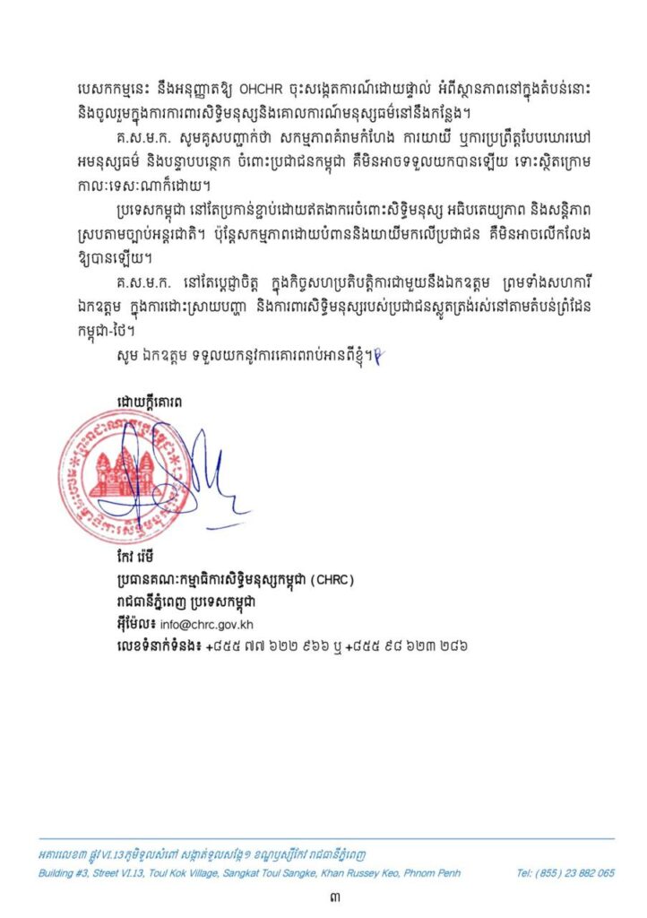 ភ្នំពេញ ៖ គណៈកម្មាធិការសិទ្ធិមនុស្សកម្ពុជា (គ.ស.ម.ក.) បានដាក់បណ្តឹងទៅការិយាល័យឧត្តមស្នងការអង្គការសហប្រជាជាតិទទួលបន្ទុកសិទ្ធិមនុស្ស នៅទីក្រុងហ្សឺណែវ ប្រទេសស្វ៊ីស អំពីការប្រើប្រាស់សំឡេងរំខានរបស់យោធាថៃ មកលើប្រជាជនកម្ពុជានៅភូមិជោគជ័យនិងព្រៃចាន់ ហើយក៏បានអញ្ជើញឧត្តមស្នងការនេះឲ្យចុះមកសង្កេតការណ៍ដោយផ្ទាល់ អំពីការរំលោភសិទ្ធិមនុស្ស ពីសំណាក់យោធាថៃ។
