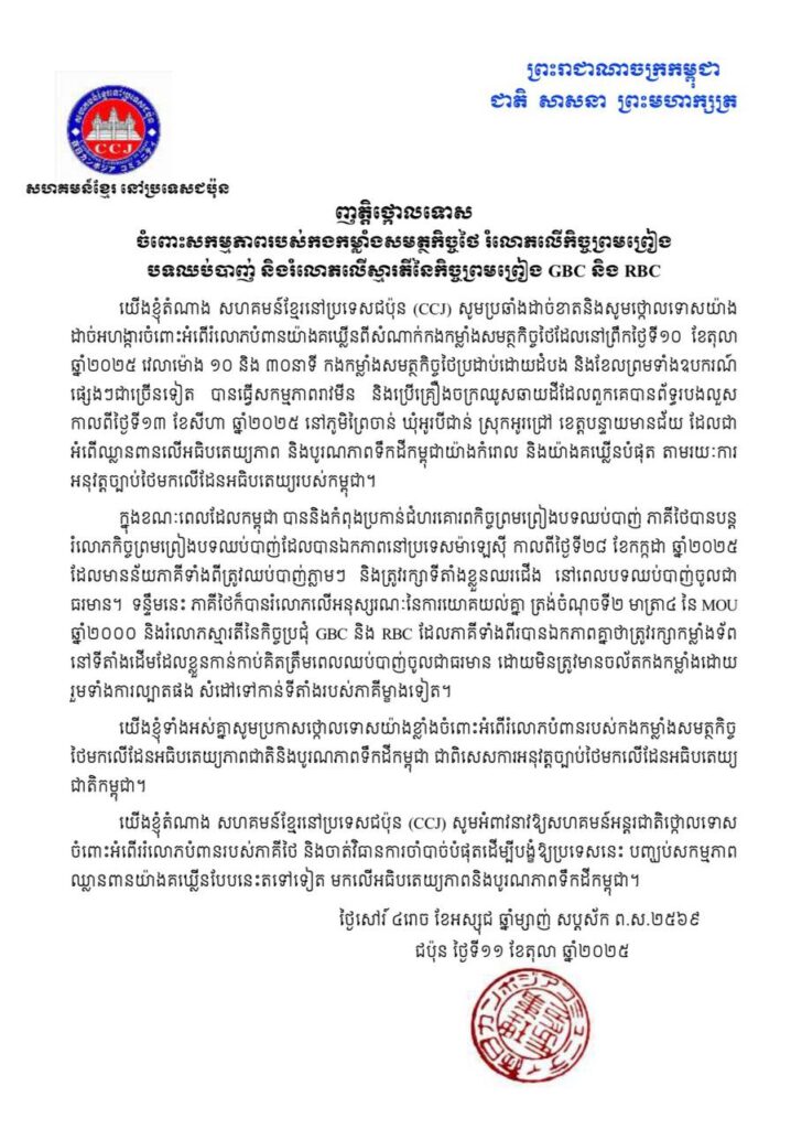 ភ្នំពេញ៖ សមាគមខ្មែរ ដែលមានមូលដ្ឋាន នៅប្រទេសជប៉ុន នៅថ្ងៃទី១១ ខែតុលា ឆ្នាំ២០២៥នេះ បានចេញញត្តិថ្កោលទោស ចំពោះសកម្មភាព របស់កងកម្លាំងសមត្ថកិច្ចថៃ ដែលបានរំលោភលើកិច្ច ព្រមព្រៀងបទឈប់បាញ់ និងរំលោភលើស្មារតីនៃកិច្ចព្រមព្រៀម GBC និង RBC។