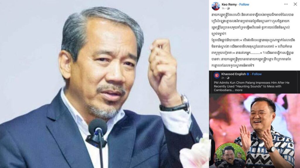ភ្នំពេញ៖ លោក កែវ រ៉េមី ប្រធានគណកម្មាធិការសិទ្ធិមនុស្សកម្ពុជា បានបោះពាក្យធ្ងន់ៗ ទៅកាន់លោក អានុទីន នាយករដ្ឋមន្រ្តីថៃ បន្ទាប់ពីនាយករដ្ឋមន្រ្តីថៃរូបនេះ បានប្រកាសកោតសរសើរ និងគោរពទង្វើដ៏ថោកទាប របស់បុគ្គល Palang ដែលបានចាក់សំឡេងខ្មោច និងឆ្កែលូ បំផិតបំភ័យពលរដ្ឋខ្មែរ នៅភូមព្រៃចាន់និងជោគជ័យ ឃុំអូរបីជាន់ ស្រុកអូរជ្រៅ ខេត្តបន្ទាយមានជ័យ។ នៅលើបណ្ដាញសង្គមហ្វេសប៊ុក នៅព្រឹកថ្ងៃទី១៣ ខែតុលា ឆ្នាំ២០២៥ លោក កែវ រ៉េមី បានលើកឡើងយ៉ាងដូចច្នេះថា « នាយករដ្ឋមន្ត្រីថៃសរសើរ និងគោរពទង្វើ របស់អាមួយដឹកអាចម៍ ដែលបានប្រើសំឡេងខ្មោចលង រំខានប្រជាជនខ្មែរ មិនឲ្យដេក ។ ហួសចិត្តនាយករដ្ឋមន្រ្តី នៃប្រទេសមួយគាំទ្រទង្វើអសីលធម៌ ខ្វះការយល់ដឹងមិនស្គាល់ច្បាប់ទម្លាប់។ខ្មែរយើងធ្លាប់និយាយថា: បើចង់មើលសន្តានមនុស្សណាម្នាក់ ដែលយើងមិនទាន់ស្គាល់វា យើងអាចមើលមនុស្ស ដែលវាសេពគប់ ហើយក៏មានពាក្យមួយទៀតថា: នាងរត់រកអ្នក………..។ យើងអាចធ្វើការសន្និដ្ឋានបានថា: នាយករដ្ឋមន្ត្រីមួយនេះ ជានាយករដ្ឋមន្ត្រីកន្ថោរ ពីព្រោះមានតែកន្ថោរទេ ដែលទទួលស្វាគមន៍អាចម៍»៕