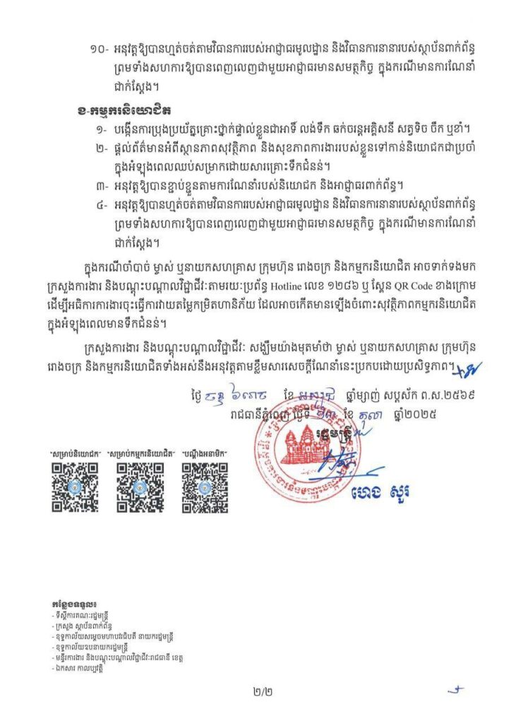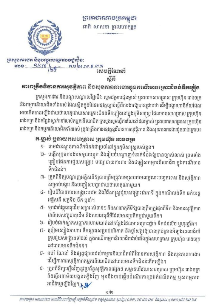 តាមរយៈសេចក្តីជូនដំណឹង លោក ហេង សួរ រដ្ឋមន្ត្រីក្រសួងការងារ និងបណ្តុះបណ្តាលវិជ្ជាជីវៈ បានបញ្ជាក់ជូនទៅម្ចាស់ ឬនាយកសហគ្រាស ក្រុមហ៊ុន រោងចក្រ នូវការណែនាំ ១០ចំណុច ដើម្បីបង្ការហានិភ័យ ដែលអាចកើតមានឡើងជាយថាហេតុ ដោយសារគ្រោះជំនន់ទឹកភ្លៀង នៅក្នុងភូមិសាស្ត្រ ដែលមានសហគ្រាស ក្រុមហ៊ុន រោងចក្រ និងកន្លែងស្នាក់នៅរបស់កម្មករនិយោជិត ។