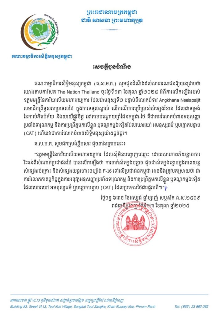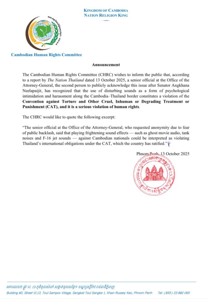 ភ្នំពេញ ៖ គណៈកម្មាធិការសិទ្ធិមនុស្សកម្ពុជា នៅថ្ងៃទី១៣ ខែតុលា ឆ្នាំ២០២៥នេះ បានចេញសេចក្ដីជូនដំណឹងអំពីការលើកឡើងរបស់ ឧត្តមមន្ត្រីនៃការិយាល័យមហាអយ្យការ ជាមនុស្សទី២ បន្ទាប់ពីលោកស្រី Angkhana Neelapaijit សមាជិកព្រឹទ្ធសភាប្រទេសថៃ ក្នុងការទទួលស្គាល់ លើករណីការប្រើប្រាស់សំឡេងរំខាន ដែលជាទម្រង់ នៃការបំភិតបំភ័យ និងយាយីផ្លូវចិត្ត នៅតាមបណ្តោយព្រំដែនកម្ពុជា-ថៃ គឺជាការរំលោភបំពានអនុសញ្ញា ប្រឆាំងទារុណកម្ម និងការប្រព្រឹត្តមកលើខ្លួន ឬទណ្ឌកម្មឯទៀតដែលឃោរឃៅអមនុស្សធម៌ ឬបន្ថោកបន្ទាប (CAT) ហើយវាជាការរំលោភបំពានសិទ្ធិមនុស្សយ៉ាងធ្ងន់ធ្ងរ៕