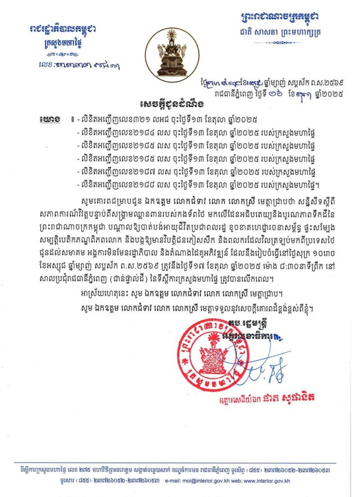 ភ្នំពេញ ៖ ក្រសួងមហាផ្ទៃ នៅថ្ងៃទី១៨ ខែតុលា ឆ្នាំ២០២៥ ចេញសេចក្តី ជូនដំណឹងស្តីពី ការលើកពេលរៀបចំសន្និសីទ ស្តីពីសភាពការណ៍ វិវត្តបន្ទាប់ពីសង្គ្រាមឈ្លានពានរបស់កងទ័ពថៃ មកលើដែនអធិបតេយ្យនិងបូរណភាពទឹកដីកម្ពុជា ជូនដល់សមាគម អង្គការមិនមែនរដ្ឋាភិបាល និងដៃគូអភិវឌ្ឍន៍ ដែលរៀបចំដោយក្រសួងមហាផ្ទៃ ៕