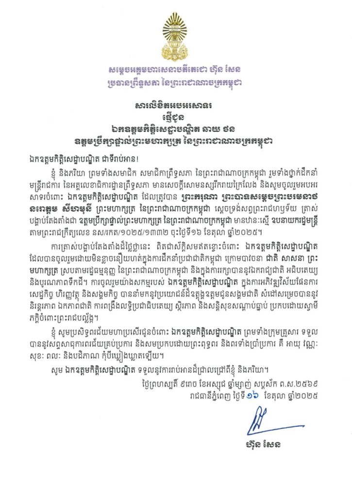 សម្ដេចតេជោ ហ៊ុន សែន ផ្ញើសារលិខិតអបអរសាទរជូន លោកកិត្តិសេដ្ឋាបណ្ឌិត ឆាយ ថន ក្នុងឱកាសព្រះមហាក្សត្រត្រាស់បង្គាប់តែងតាំង ជា ឧត្តមប្រឹក្សាផ្ទាល់ព្រះមហាក្សត្រនៃព្រះរាជាណាចក្រកម្ពុជា ឋានៈស្មើឧបនាយករដ្ឋមន្ត្រី