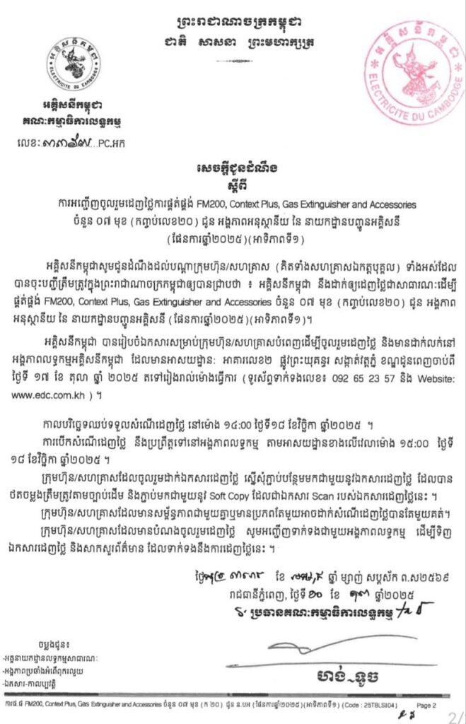 ភ្នំពេញ ៖ អគ្គិសនីកម្ពុជា សូមជូនដំណឹង ដល់បណ្តាក្រុមហ៊ុន/សហគ្រាស (គិតទាំងសហគ្រាសឯកត្តបុគ្គល) ទាំងអស់ដែល បានចុះបញ្ជីត្រឹមត្រូវក្នុងព្រះរាជាណាចក្រកម្ពុជា ឲ្យបានជ្រាបថា ៖ អគ្គិសនីកម្ពុជា នឹងដាក់ឲ្យដេញថ្លៃ ជាសាធារណៈដើម្បី ផ្គត់ផ្គង់ FM200, Context Plus, Gas Extinguisher and Accessories ចំនួន ០៧ មុខ (កញ្ចប់លេខ២០) ជូន អង្គភាព អនុស្ថានីយ នៃ នាយកដ្ឋានបញ្ជូនអគ្គិសនី (ផែនការឆ្នាំ២០២៥) (អាទិភាពទី១)។