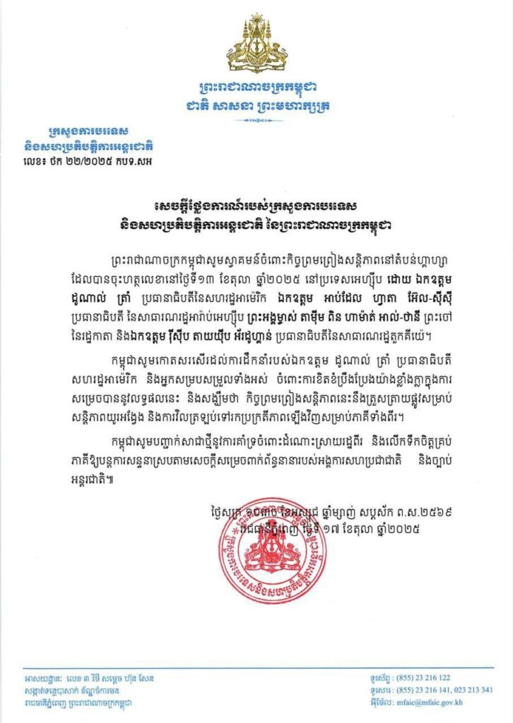 កម្ពុជា កោតសរសើរ លោកដូណាល់ ត្រាំដែលបានប្រឹងប្រែងឱ្យមានកិច្ចព្រមព្រៀងសន្តិភាពនៅ ហ្កាហ្សា