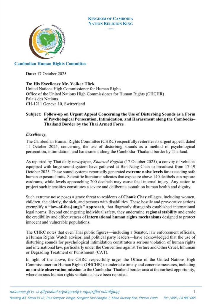 ភ្នំពេញ ៖ គណៈកម្មាធិការ សិទ្ធិមនុស្សកម្ពុជា (គ.ស.ម.ក.) បានជំរុញឱ្យការិយាល័យ ឧត្តមស្នងការអង្គការ សហប្រជាជាតិ ទទួលបន្ទុកសិទ្ធិមនុស្ស (OHCHR) ចុះសង្កេតការណ៍ឱ្យបានឆាប់ដោយផ្ទាល់ ពាក់ព័ន្ធនឹងការប្រើសំឡេងរំខាន ជាទម្រង់នៃការធ្វើទុក្ខបុកម្នេញ ការបំភិតបំភ័យ និងការយាយីផ្លូវចិត្ត នៅតាមបណ្តោយ ព្រំដែនកម្ពុជា-ថៃ។