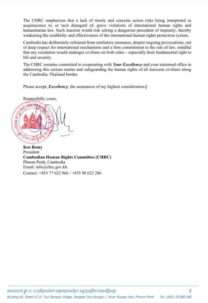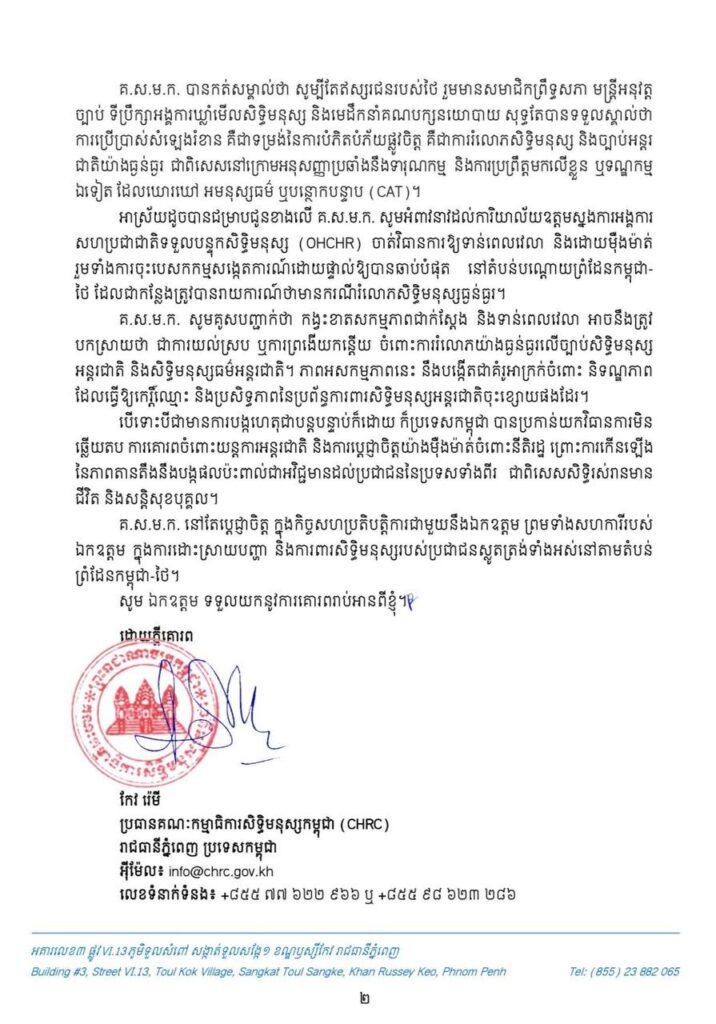 គ.ស.ម.ក. នៅតែប្តេជ្ញាចិត្ត ក្នុងកិច្ចសហប្រតិបត្តិការជាមួយនឹងឯកឧត្តម ព្រមទាំងសហការីរបស់ ឯកឧត្តម ក្នុងការដោះស្រាយបញ្ហា និងការពារសិទ្ធិមនុស្សរបស់ប្រជាជនស្លូតត្រង់ទាំងអស់នៅតាមតំបន់ ព្រំដែនកម្ពុជា-ថៃ។
