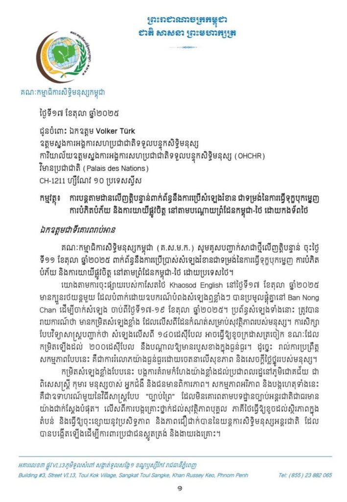 គណៈកម្មាធិការ សិទ្ធិមនុស្សកម្ពុជា ជំរុញ OHCHR ចុះសង្កេតការណ៍ ឱ្យបានឆាប់ដោយផ្ទាល់ ពាក់ព័ន្ធនឹង ការប្រើសំឡេងរំខាន នៅតាមបណ្តោយ ព្រំដែនកម្ពុជា-ថៃ