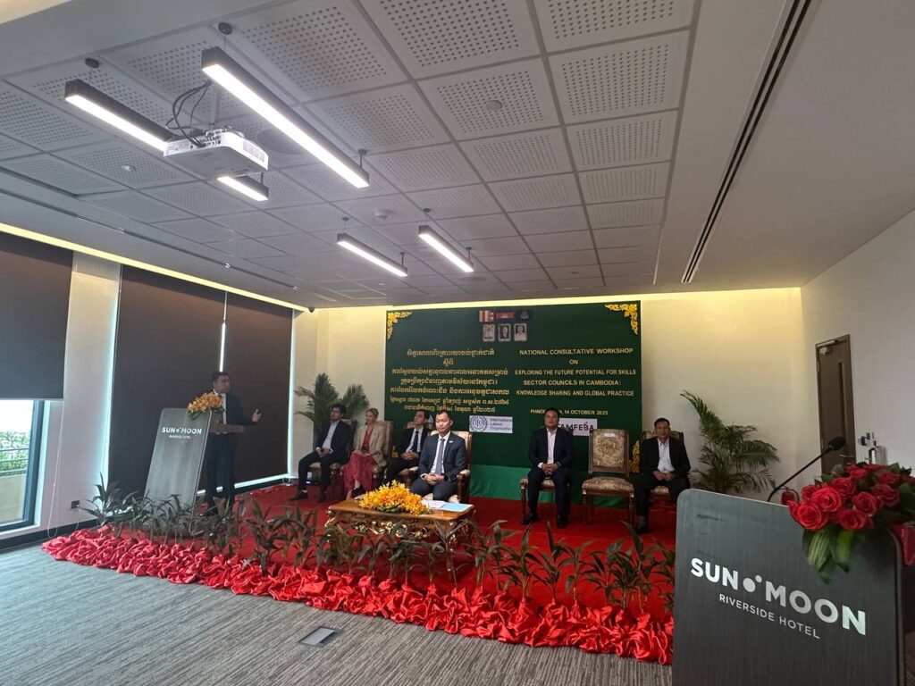 ភ្នំពេញ៖ ក្រសួងការងារ និងបណ្ដុះបណ្ដាលវិជ្ជាជីវៈ និងអង្គការអន្តរជាតិខាងការងារ (ILO) បានរៀបចំសិក្ខាសាលាពិគ្រោះយោបល់ថ្នាក់ជាតិ ស្ដីពី “ការស្វែងយល់សក្ដានុពលនាពេលអនាគត សម្រាប់ក្រុមប្រឹក្សាជំនាញតាមវិស័យនៅកម្ពុជា៖ ការចែករំលែកចំណេះដឹង និងការអនុវត្តជាសកល” ក្រោមអធិបតីភាពលោក គួច សុមាន រដ្ឋលេខាធិការក្រសួងការងារ និងបណ្ដុះបណ្ដាលវិជ្ជាជីវៈ កាលពីថ្ងៃទី១៤ ខែតុលា ឆ្នាំ២០២៥ នៅសណ្ឋាគារ Sun & Moon Riverside Hotel។