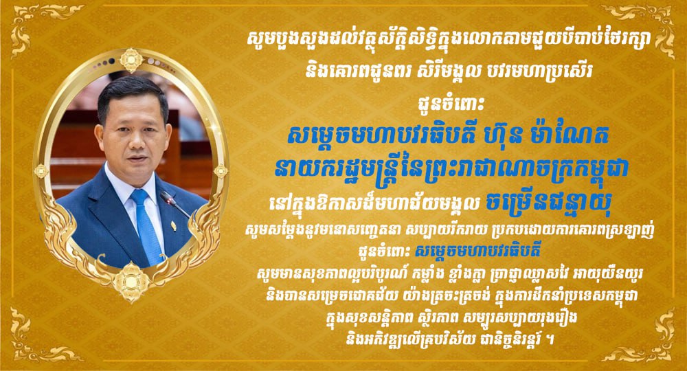 នាឱកាសដ៏ថ្លៃថ្លានេះ យើងខ្ញុំ សូមកោតសរសើរចំពោះ សម្តេចមហាបវរធិបតី ហ៊ុន ម៉ាណែត ដែលបានខិតខំប្រឹងប្រែងអស់ពីកម្លាំងកាយចិត្ត ប្រាជ្ញាស្មារតី ដោយមិនខ្លាចនឿយហត់ដឹកនាំរាជរដ្ឋាភិបាលបម្រើឧត្តមប្រយោជន៍ជាតិ និងប្រជាជន ជាពិសេសបន្តថែរក្សានូវសុខសន្តិភាព ស្ថិរភាពនយោបាយ ស្ថិរភាពម៉ាក្រូសេដ្ឋកិច្ច កំណើនសេដ្ឋកិច្ចខ្ពស់ ការពារបូរណភាពទឹកដី និងអធិបតេយ្យភាពជាតិ ដែលជាមូលដ្ឋានគ្រឹះដ៏សំខាន់ក្នុងការអភិវឌ្ឍប្រទេសជាតិលើគ្រប់វិស័យ។