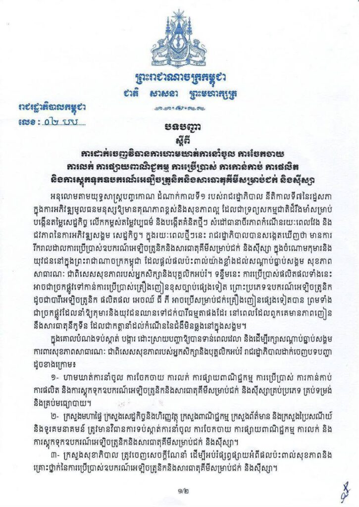 ក្នុងរយៈពេលថ្មីៗនេះ រាជរដ្ឋាភិបាល បានសង្កេតឃើញថា មានការ រីករាលដាលការប្រើប្រាស់ឧបករណ៍អេឡិចត្រូនិកនិងសារធាតុគីមីសម្រាប់ជក់ និងស៊ីស្សា ក្នុងចំណោមកុមារនិង យុវជននៅក្នុងព្រះរាជាណាចក្រកម្ពុជា ដែលផ្តល់ផលប៉ះពាល់យ៉ាងខ្លាំងដល់សណ្តាប់ធ្នាប់សង្គម សុខភាព សាធារណៈ ជាពិសេសសុខភាពរបស់អ្នកសិក្សានិងបុគ្គលិកអប់រំ។