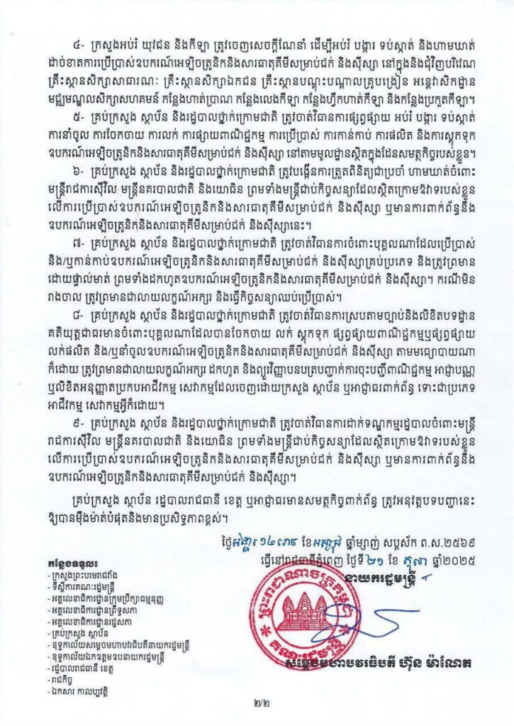 ភ្នំពេញ ៖ សម្ដេចធិបតី ហ៊ុន ម៉ាណែត នាយករដ្ឋមន្ដ្រីនៃកម្ពុជា បានចេញបទបញ្ជាស្តីពីការដាក់ចេញវិធានការហាមឃាត់ការនាំចូល ការចែកចាយ ការលក់ ការផ្សាយពាណិជ្ជកម្ម ការប្រើប្រាស់ ការកាន់កាប់ ការផលិត និងការស្តុកទុកឧបករណ៍អេឡិចត្រូនិកនិងសារធាតុគីមីសម្រាប់ជក់ និងស៊ីស្សា។