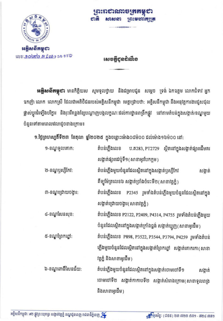 សូមអានសេចក្តីជូនដំណឹង របស់អគ្គិសនីកម្ពុជា ដូចខាងក្រោម ៖